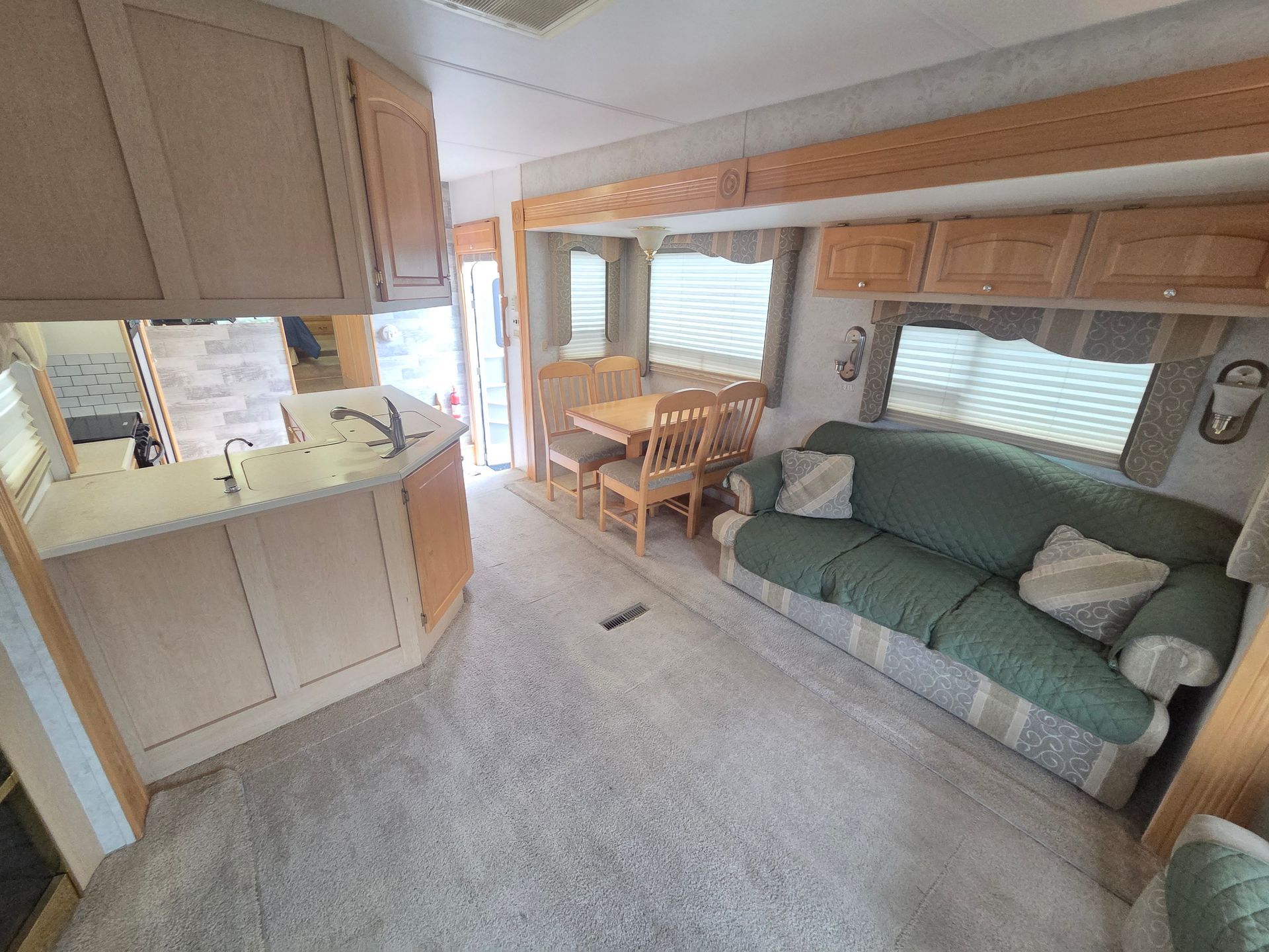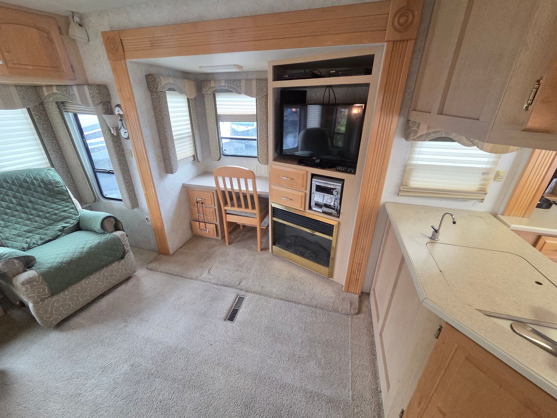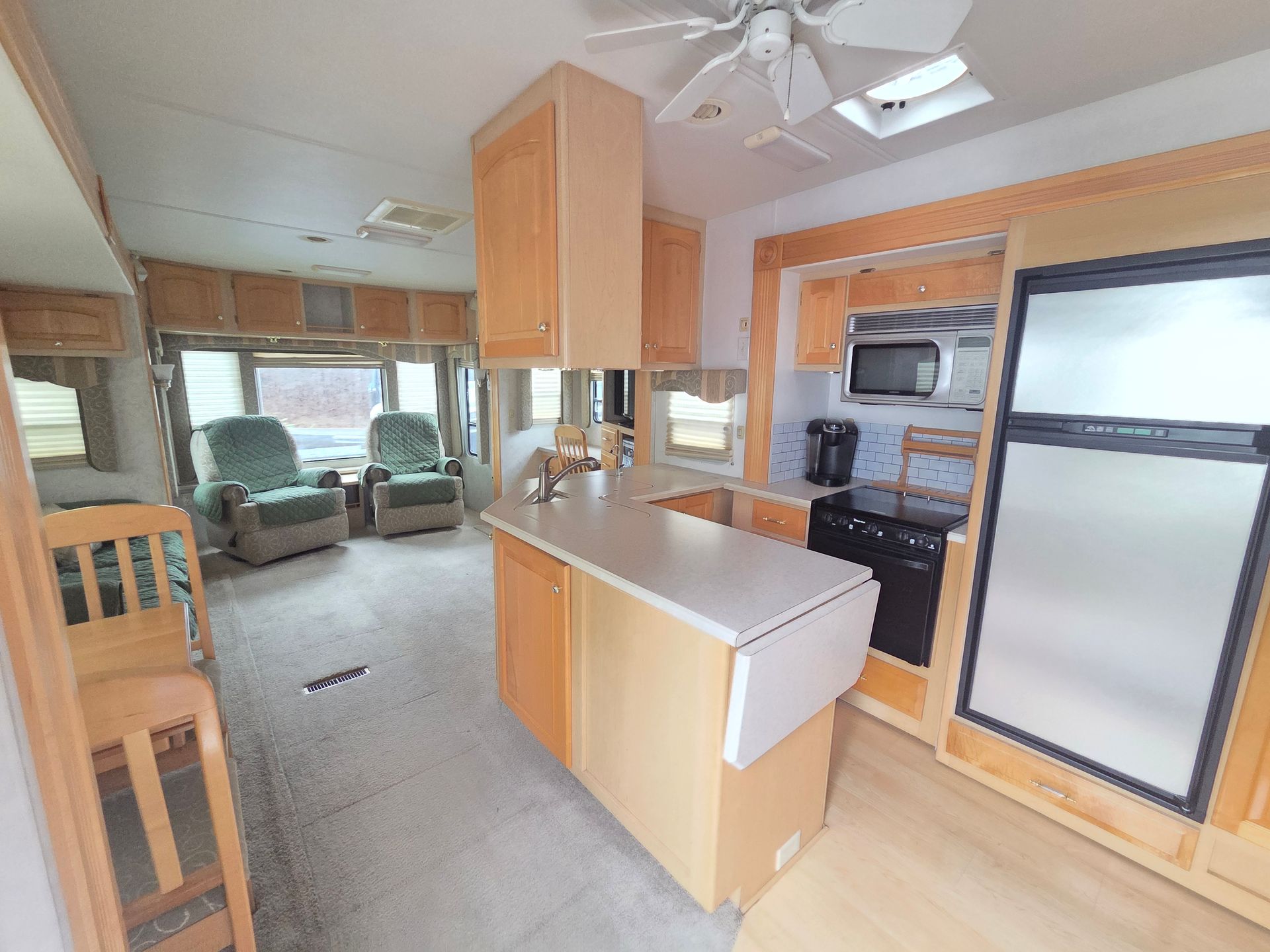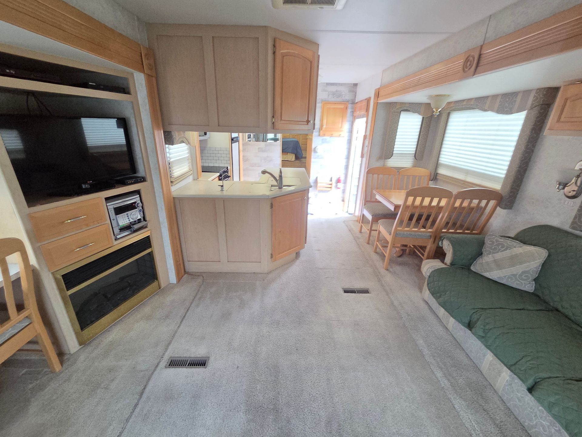 Five slide out 5th wheel beautiful spacious interior. Sleeping for 4. Front primary bedroom with king bed, on suit bath with corner shower , vanity with sink, toilet in separate enclosed arear, plum for washer dryer. Kitchen has a lot of counter space with a 2-way fridge, stove top, oven, microwave. Rear ducted roof A/C, front roof A/C, furnace, Patio awning, dual propane tanks, dual AUX batteries. Great unit for full timing or as extra living space.