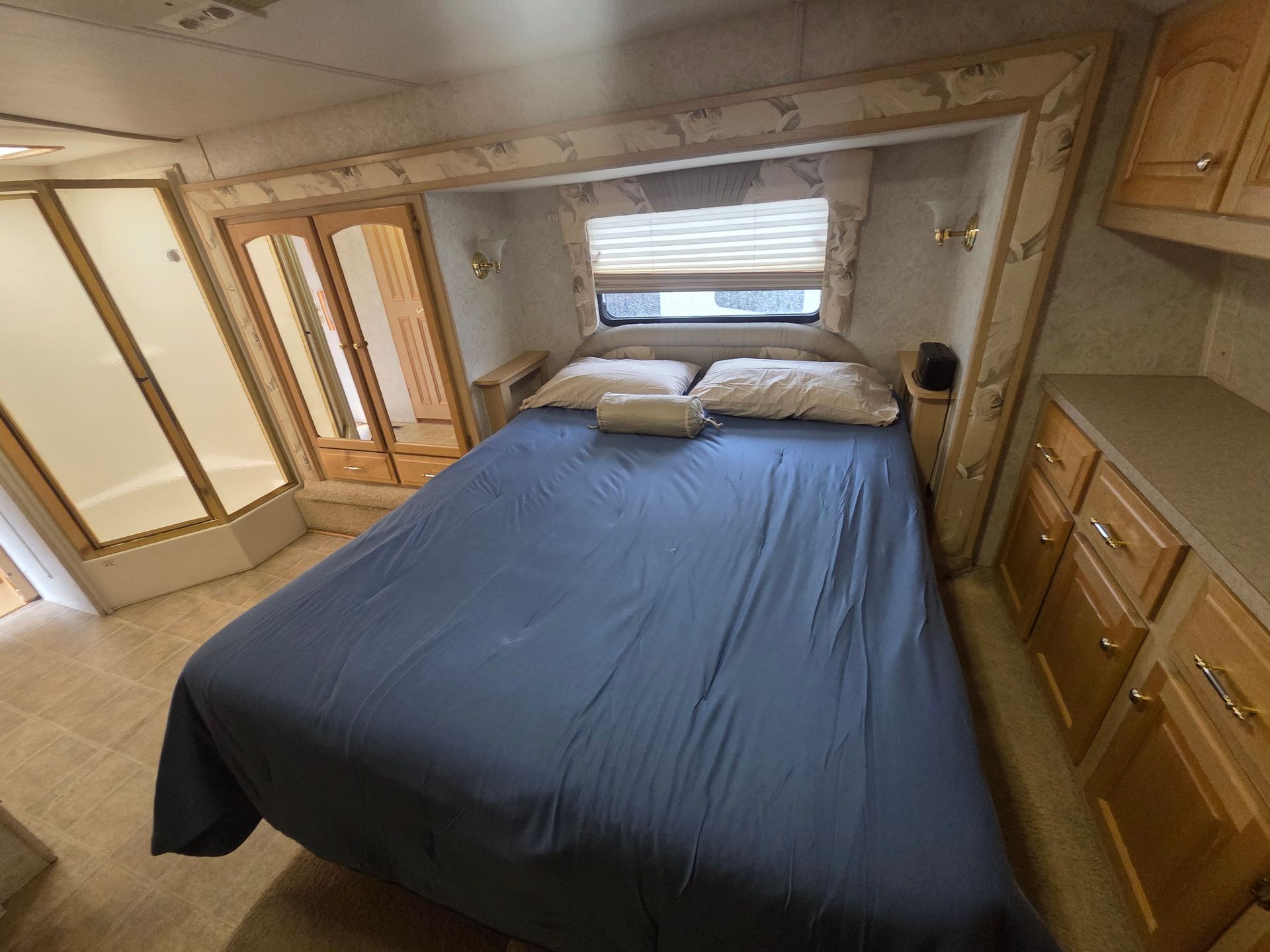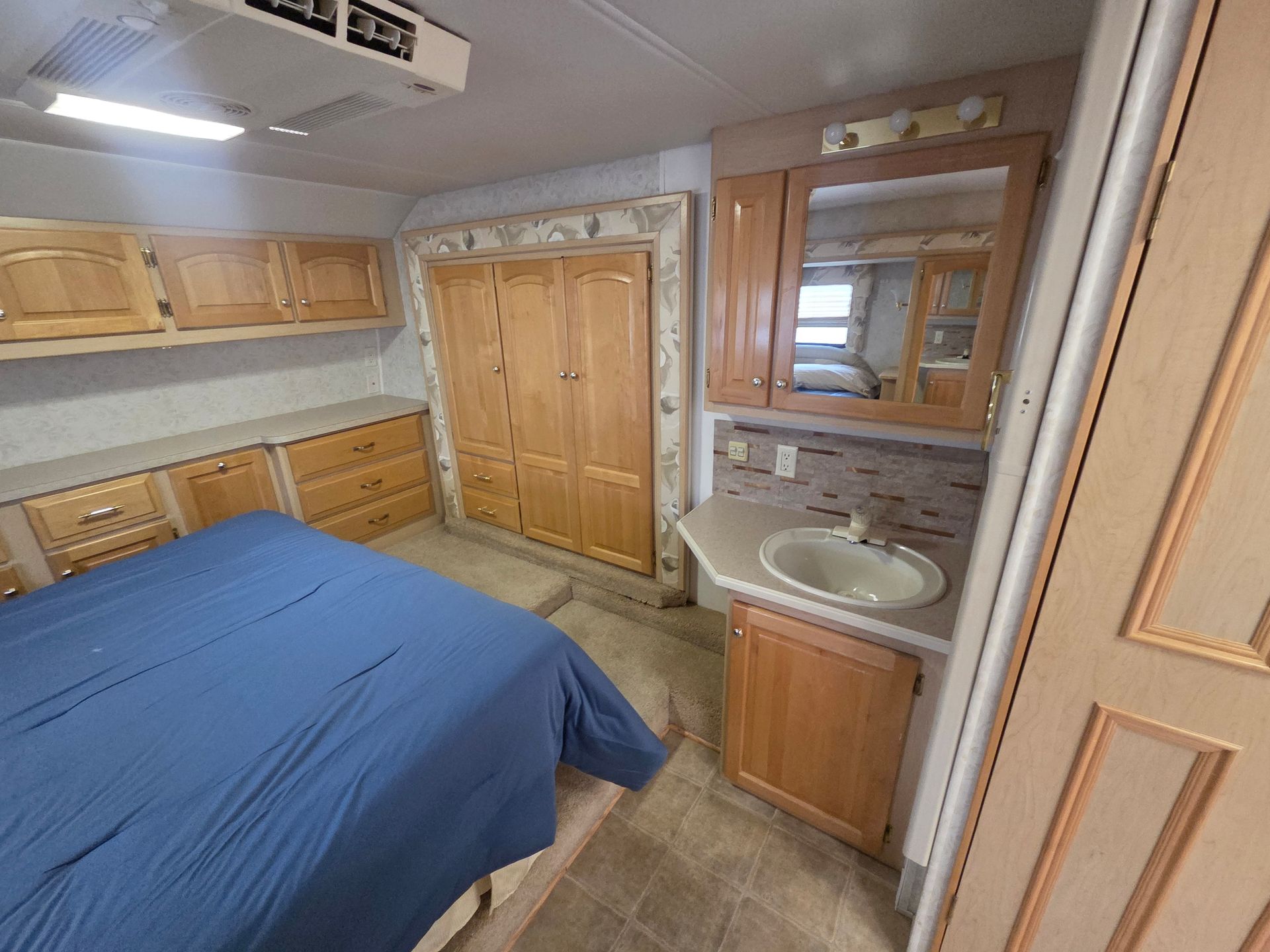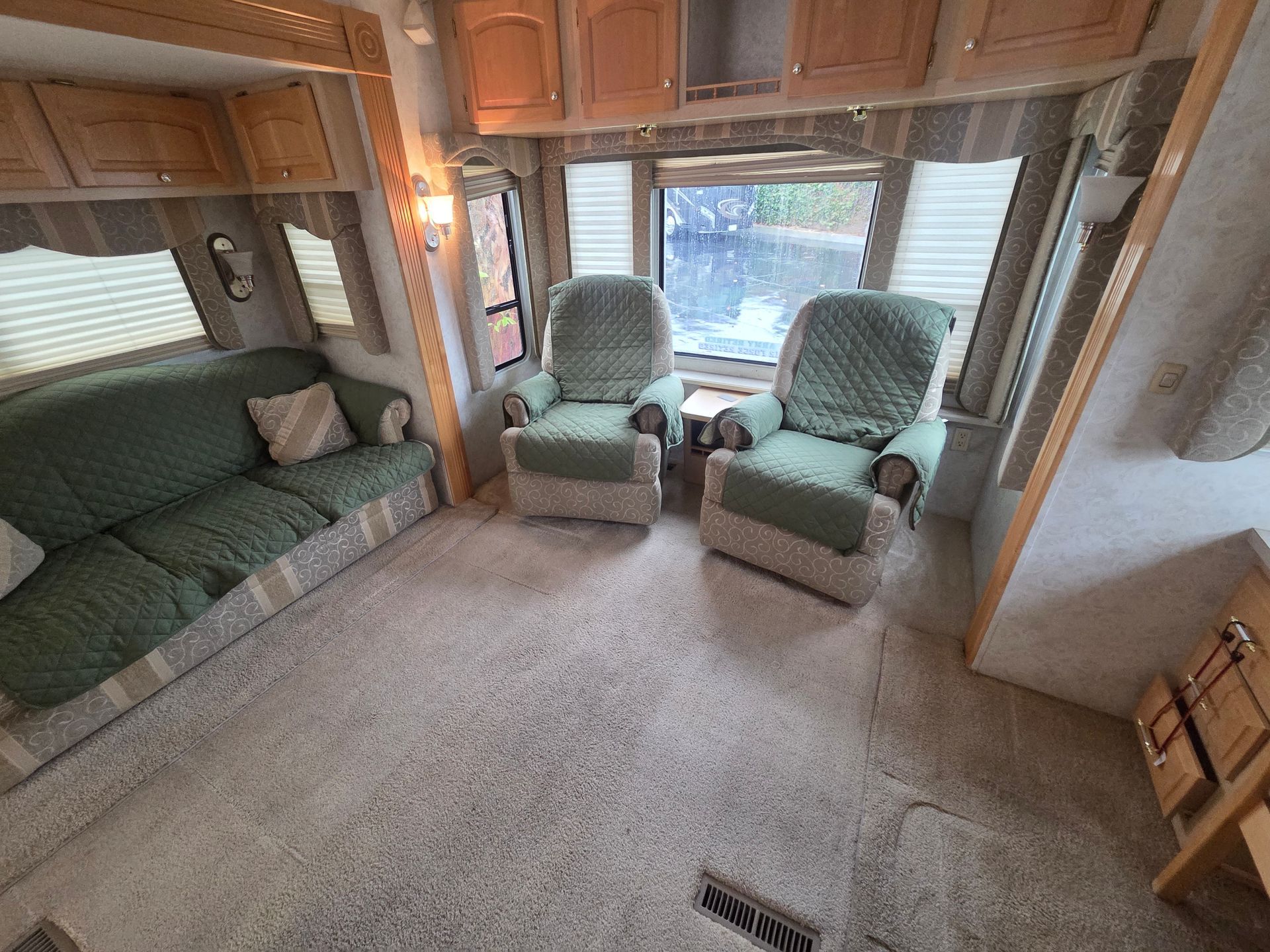 Five slide out 5th wheel beautiful spacious interior. Sleeping for 4. Front primary bedroom with king bed, on suit bath with corner shower , vanity with sink, toilet in separate enclosed arear, plum for washer dryer. Kitchen has a lot of counter space with a 2-way fridge, stove top, oven, microwave. Rear ducted roof A/C, front roof A/C, furnace, Patio awning, dual propane tanks, dual AUX batteries. Great unit for full timing or as extra living space.