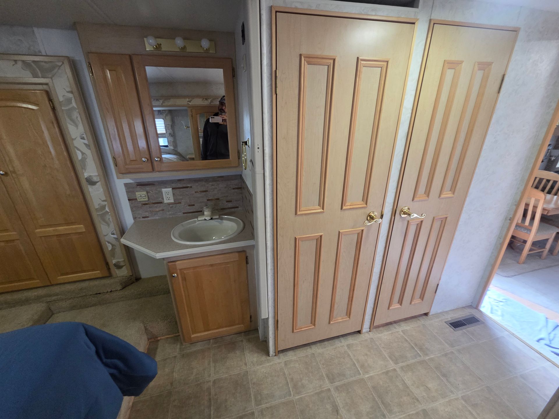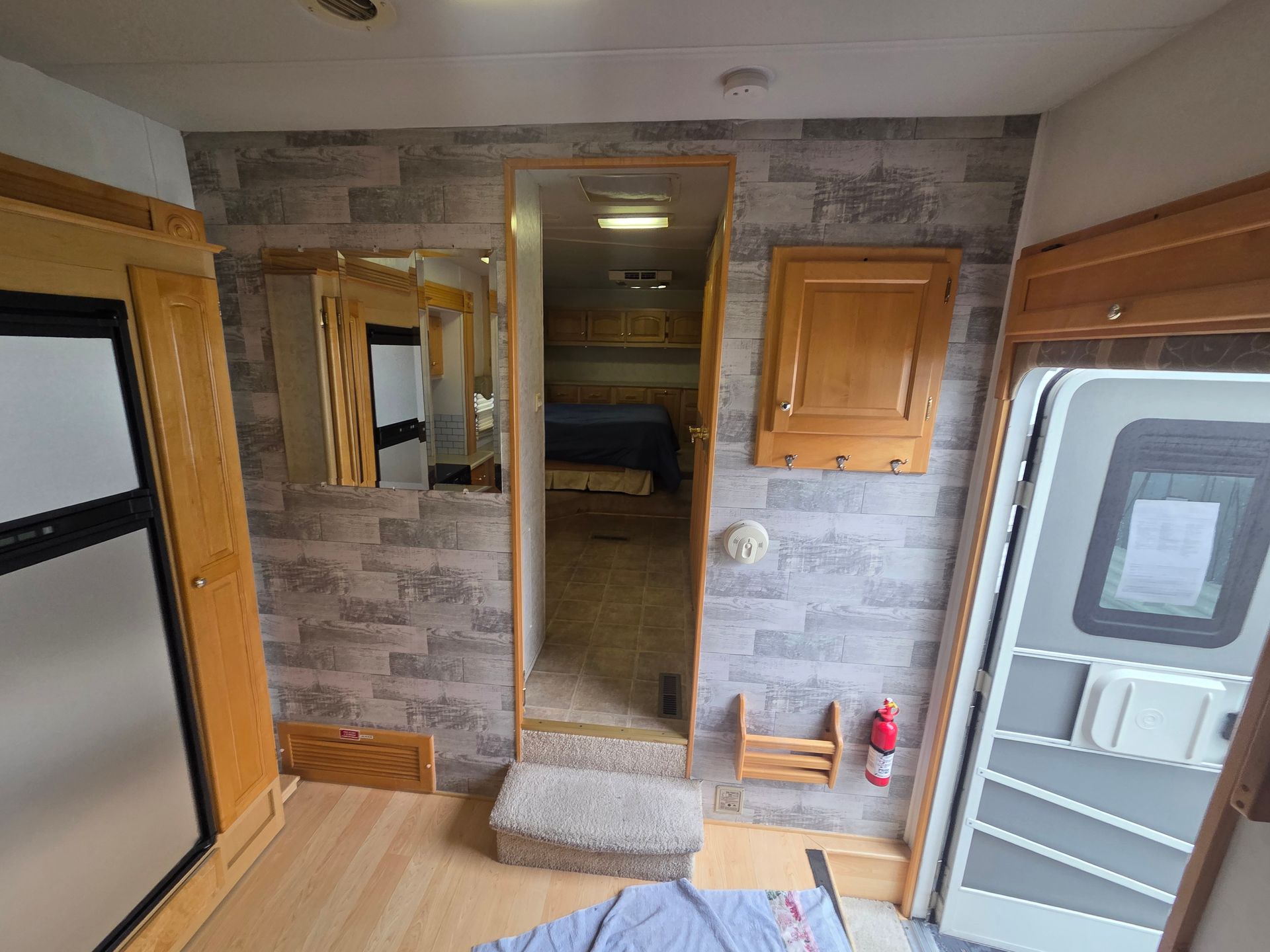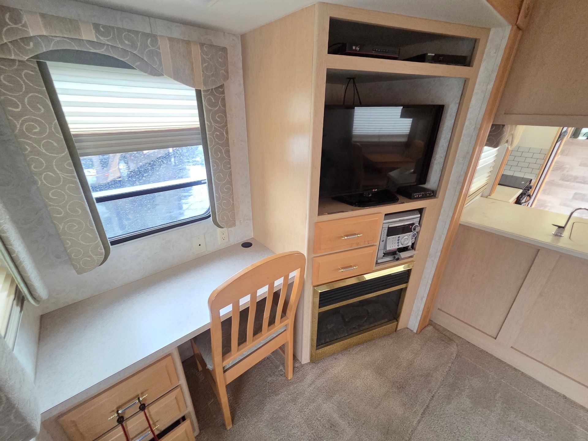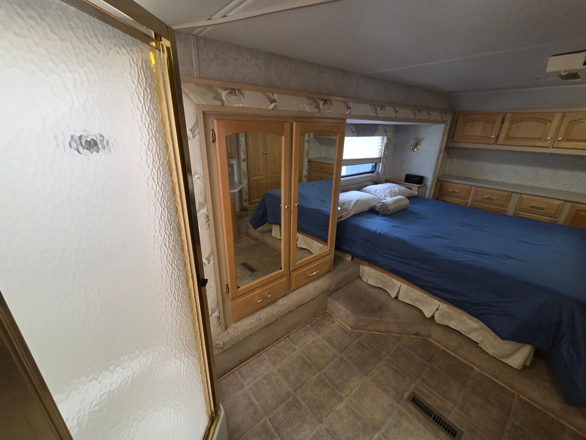 Five slide out 5th wheel beautiful spacious interior. Sleeping for 4. Front primary bedroom with king bed, on suit bath with corner shower , vanity with sink, toilet in separate enclosed arear, plum for washer dryer. Kitchen has a lot of counter space with a 2-way fridge, stove top, oven, microwave. Rear ducted roof A/C, front roof A/C, furnace, Patio awning, dual propane tanks, dual AUX batteries. Great unit for full timing or as extra living space.