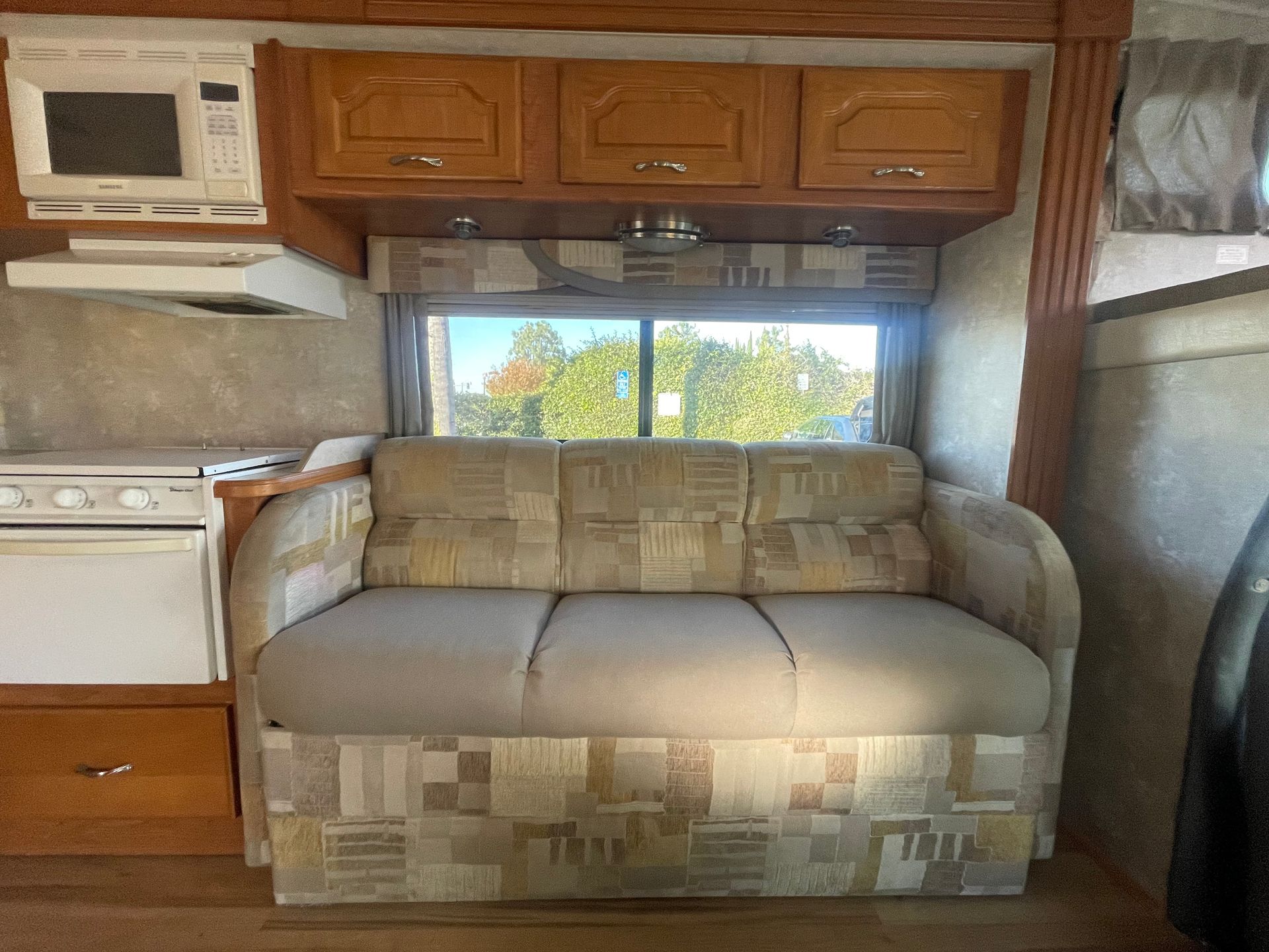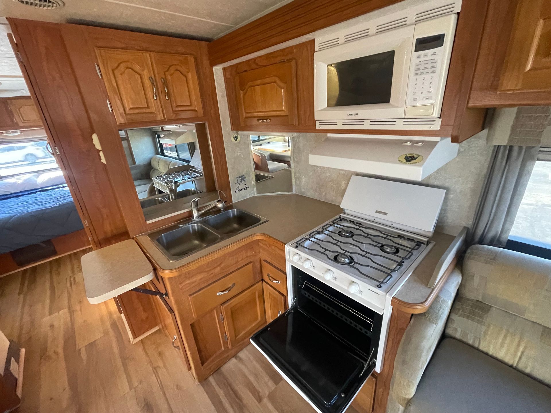 Livingroom/ Kitchen: Huge TV, Dinette, Couch, 3 Burner Stove Top, 2 Bay Sink, Oven, Microwave, Refrigerator/ Freezer Combo