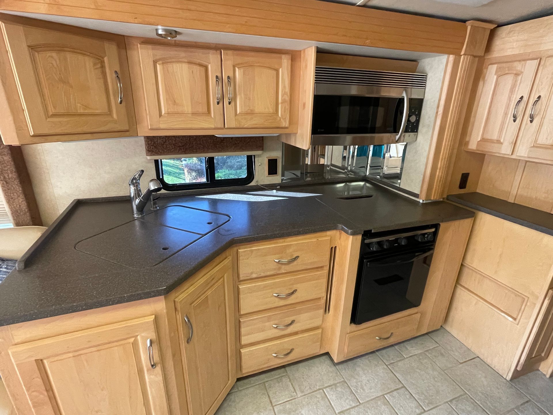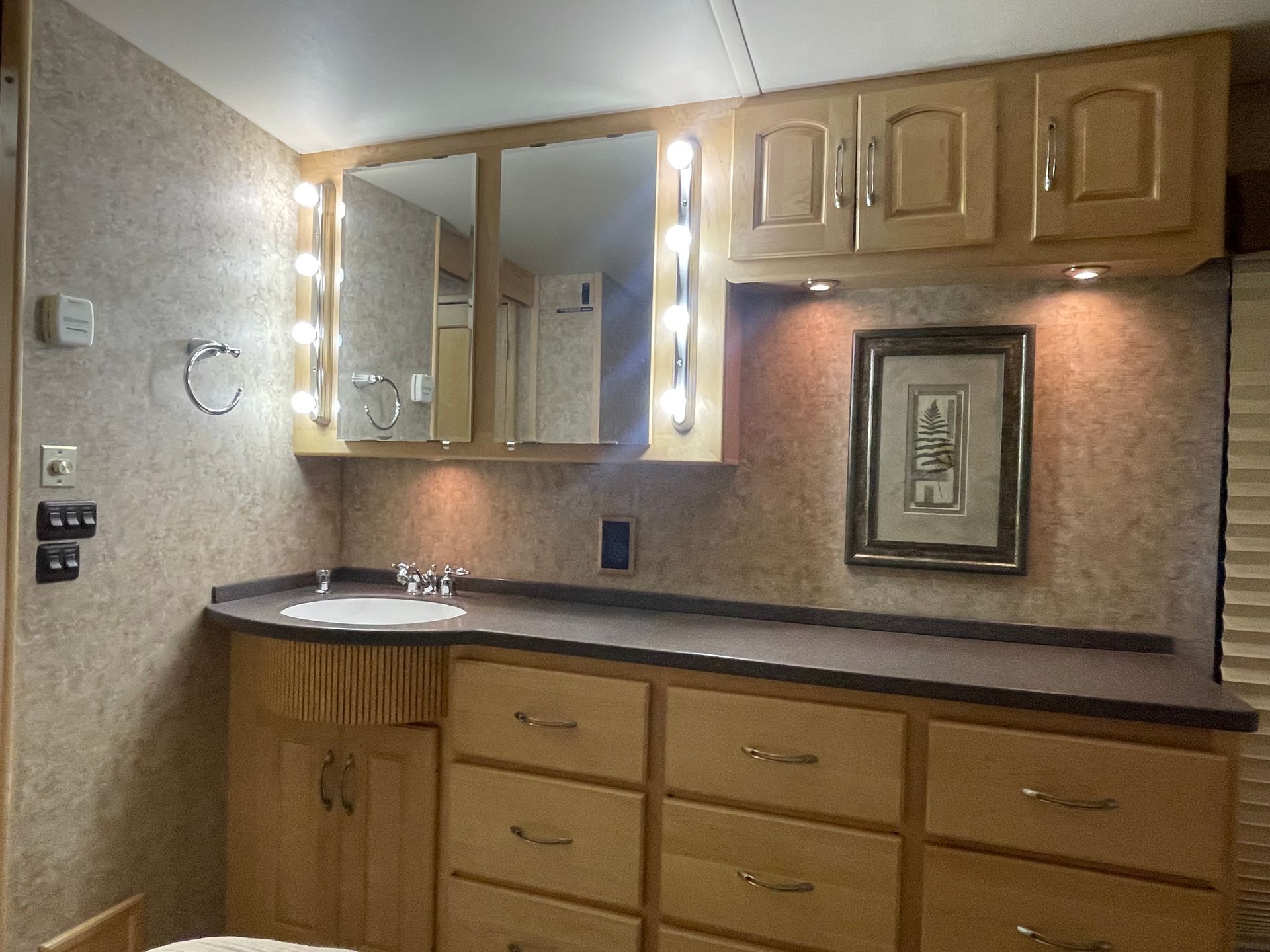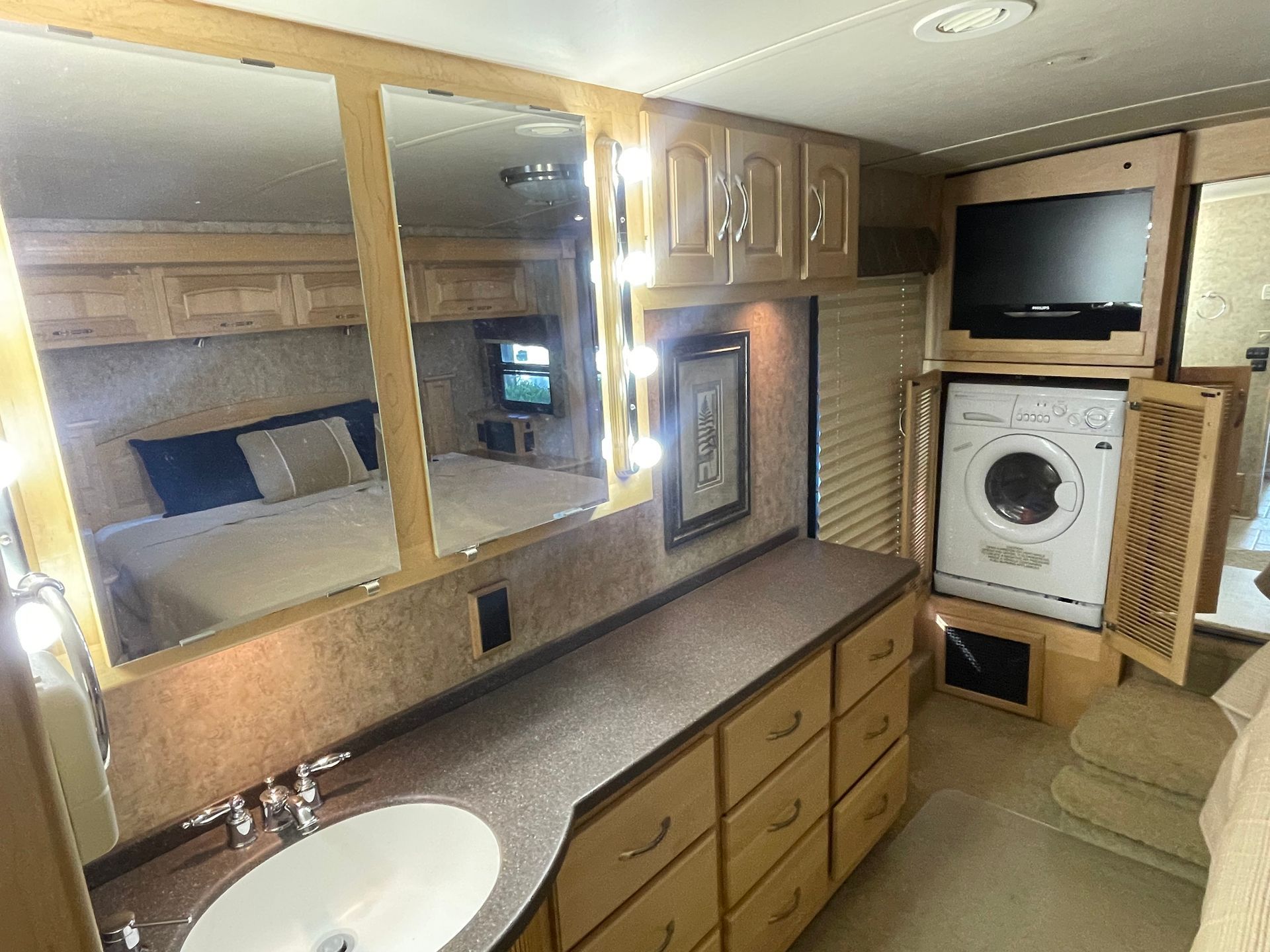 2 Sofas, TV, Dinette, 2 Bay Sink, Oven , 3 Burner Stovetop, Microwave, 4 Door Refrigerator/ Freezer, Plenty of Counter-space, Huge Shower, Porcelain Toilet, King Bed, TV, Washer/ Dryer, Bedroom Sink and Vanity Mirror,