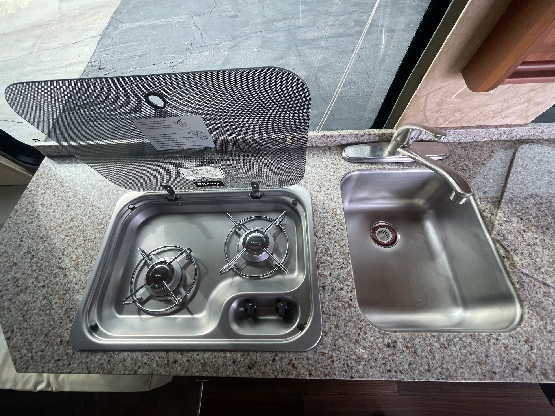 Kitchen: Microwave, Refrigerator, Sink, Glass Top 2 Burner Stove Top