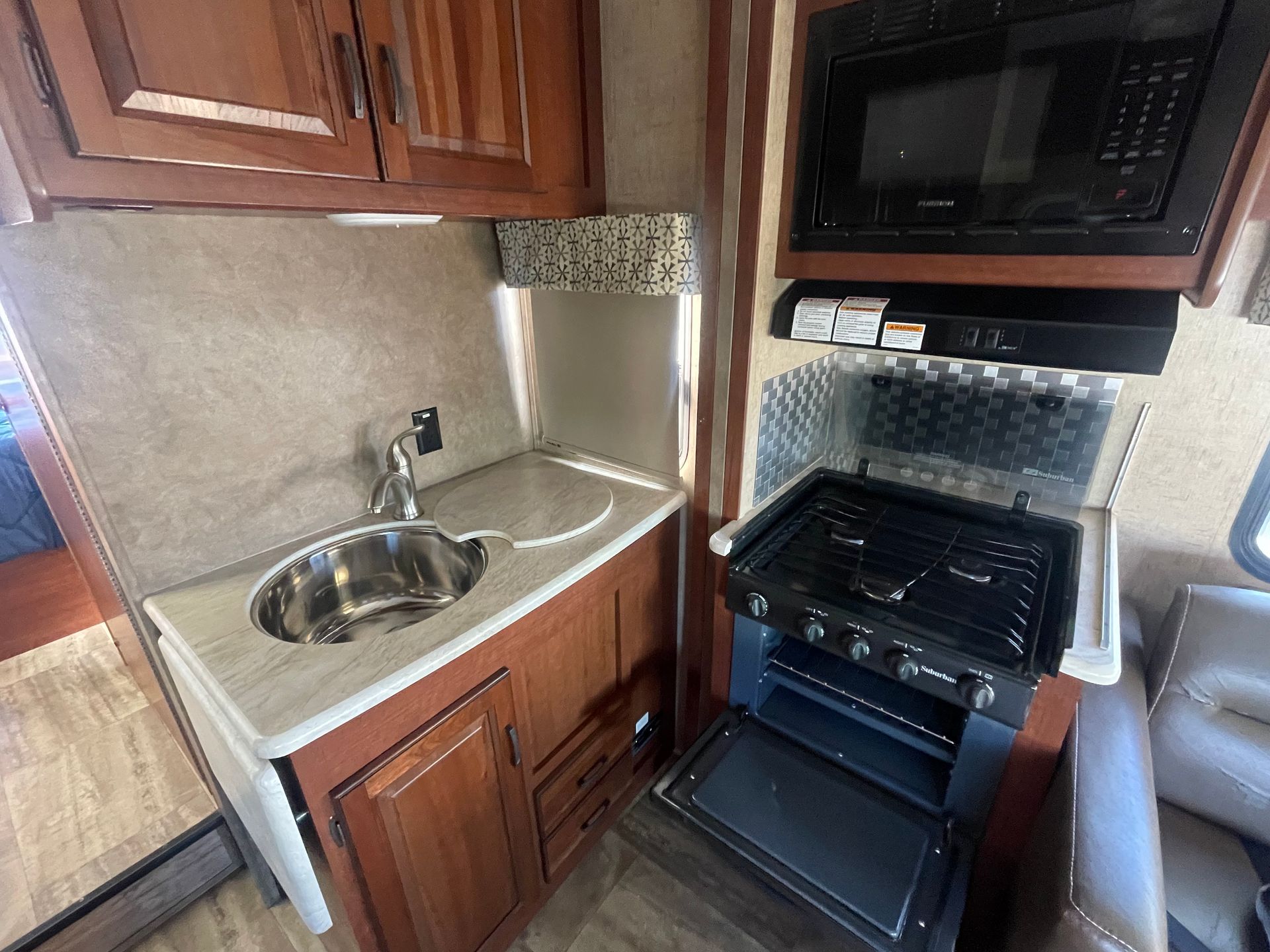 Kitchen: 3 Burner Stove Top with Glass Cover for more Surface Space, Oven, Microwave, Refrigerator/ Freezer Combo, Huge Sink