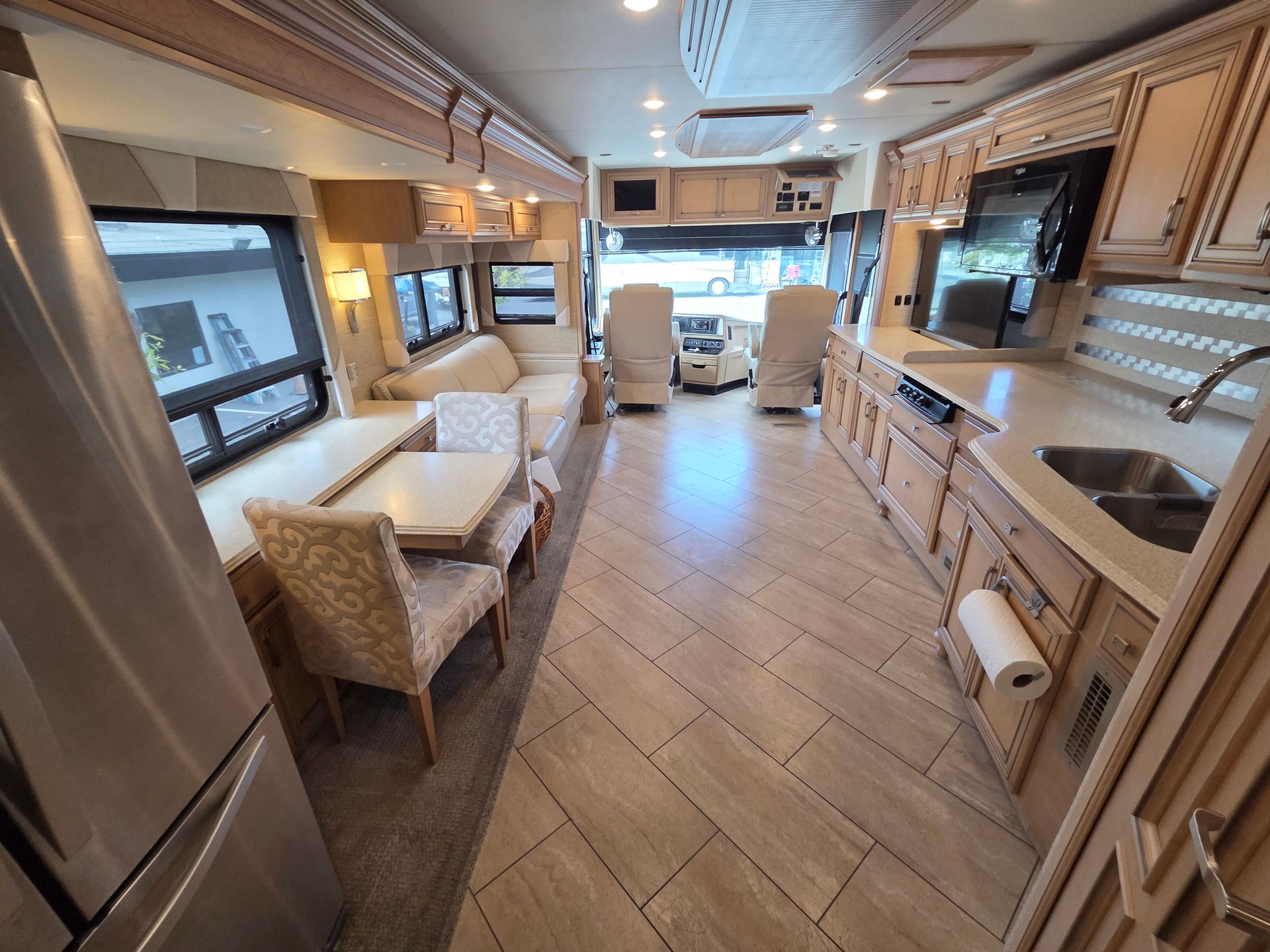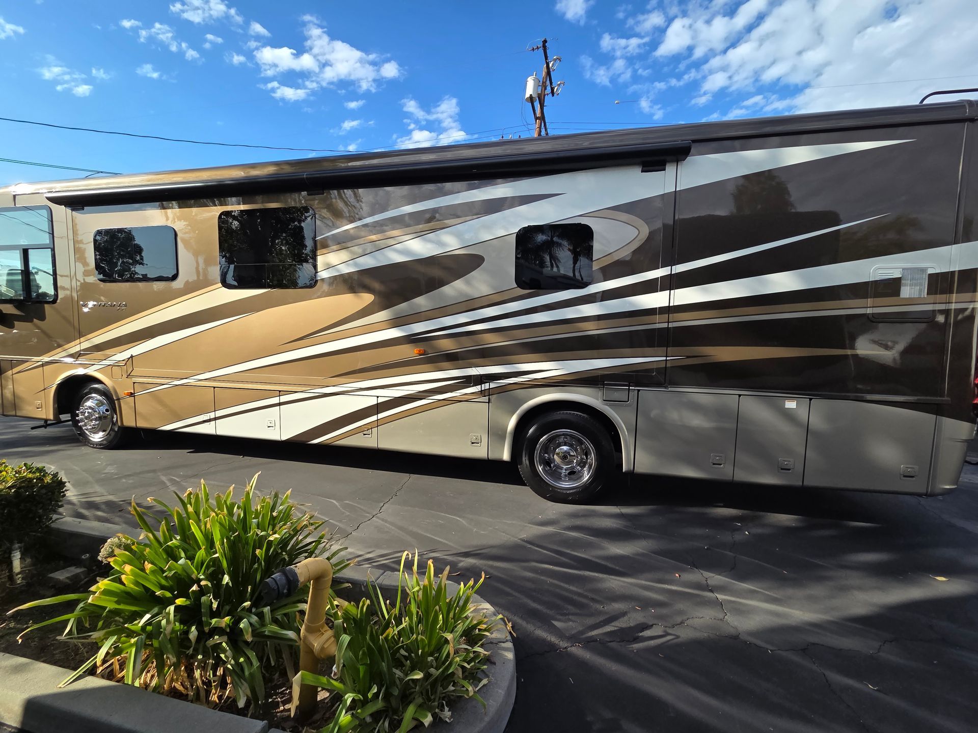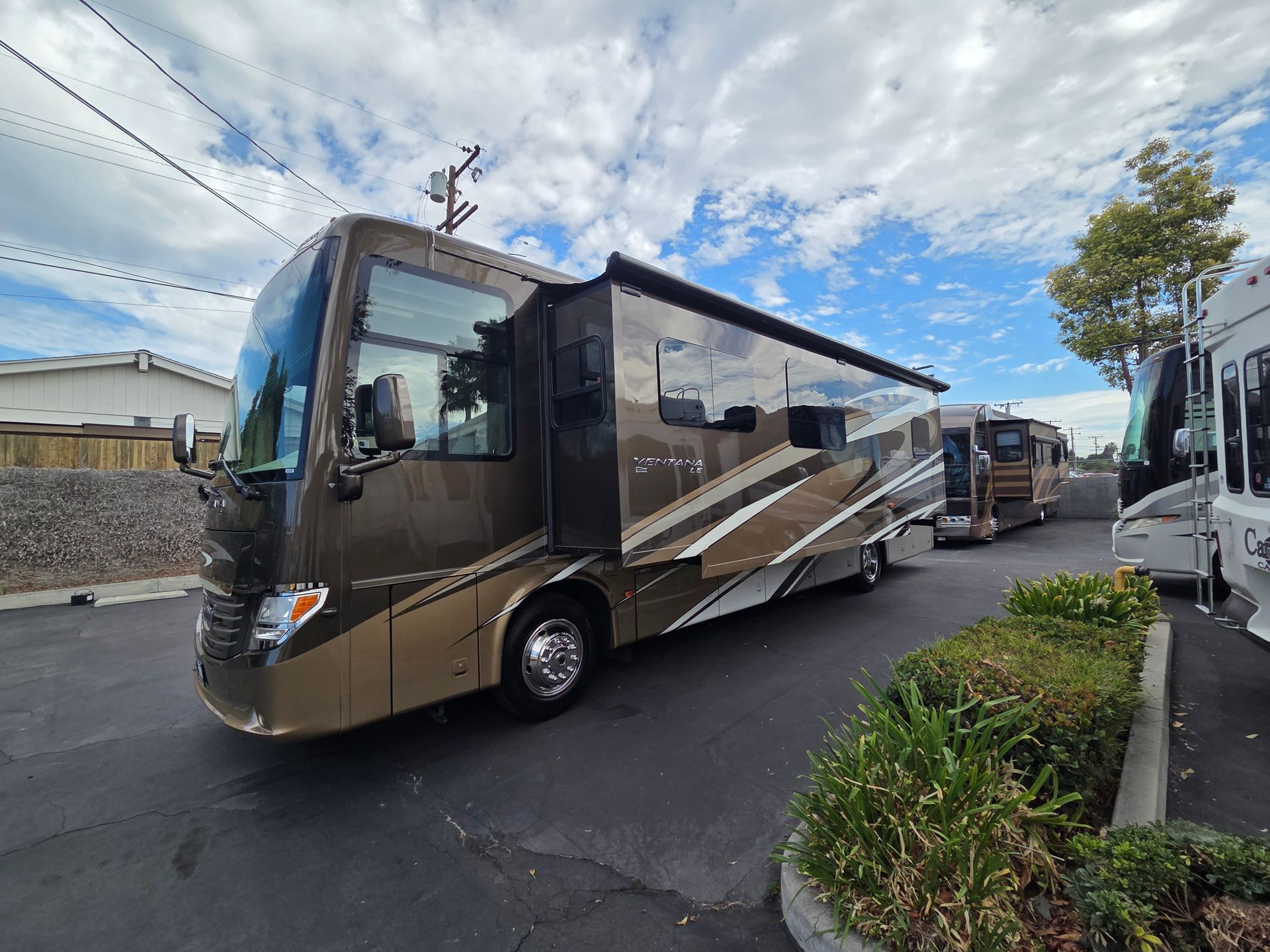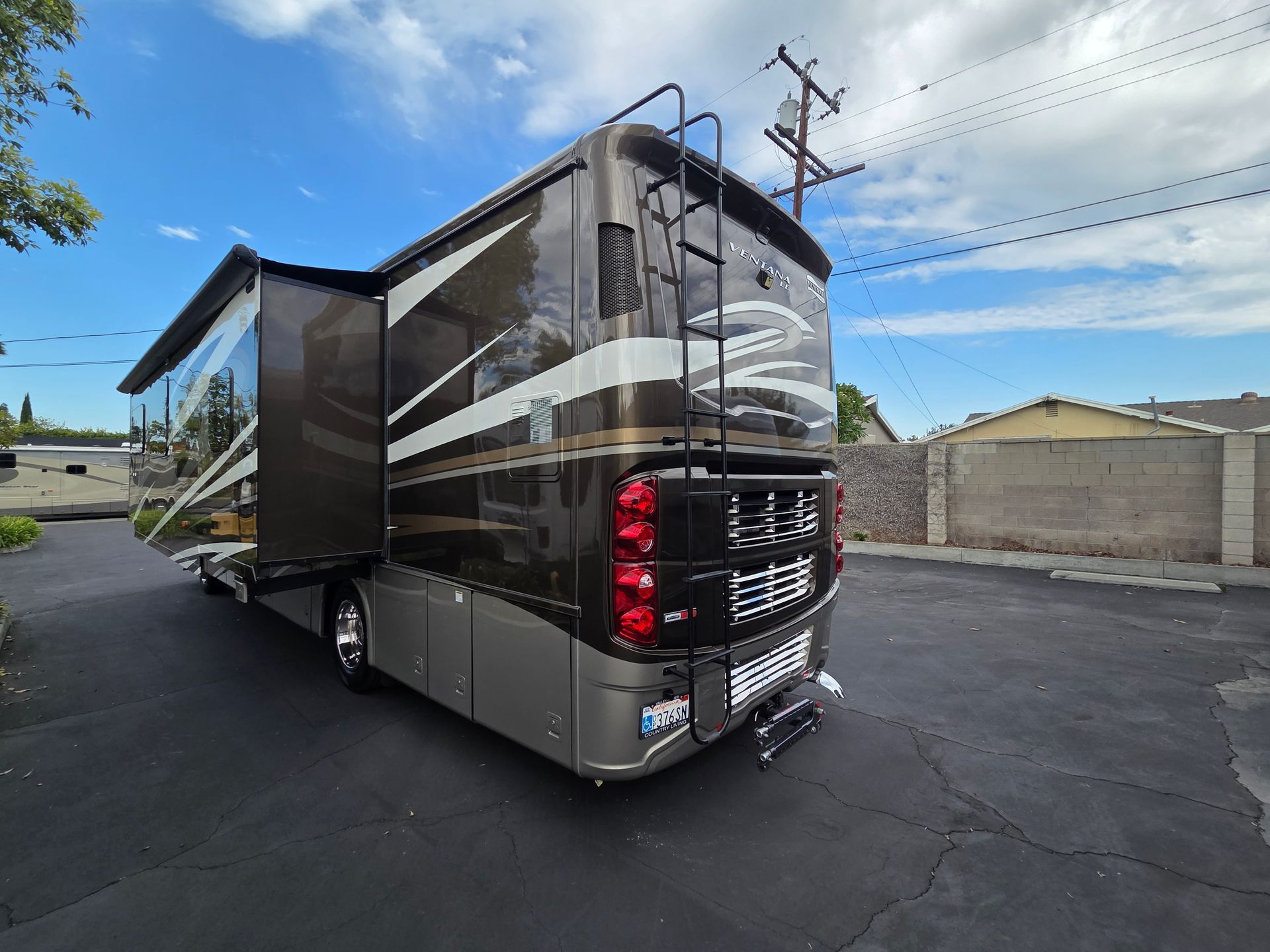 - Exterior: Full body paint, power patio awning, and a fiberglass roof