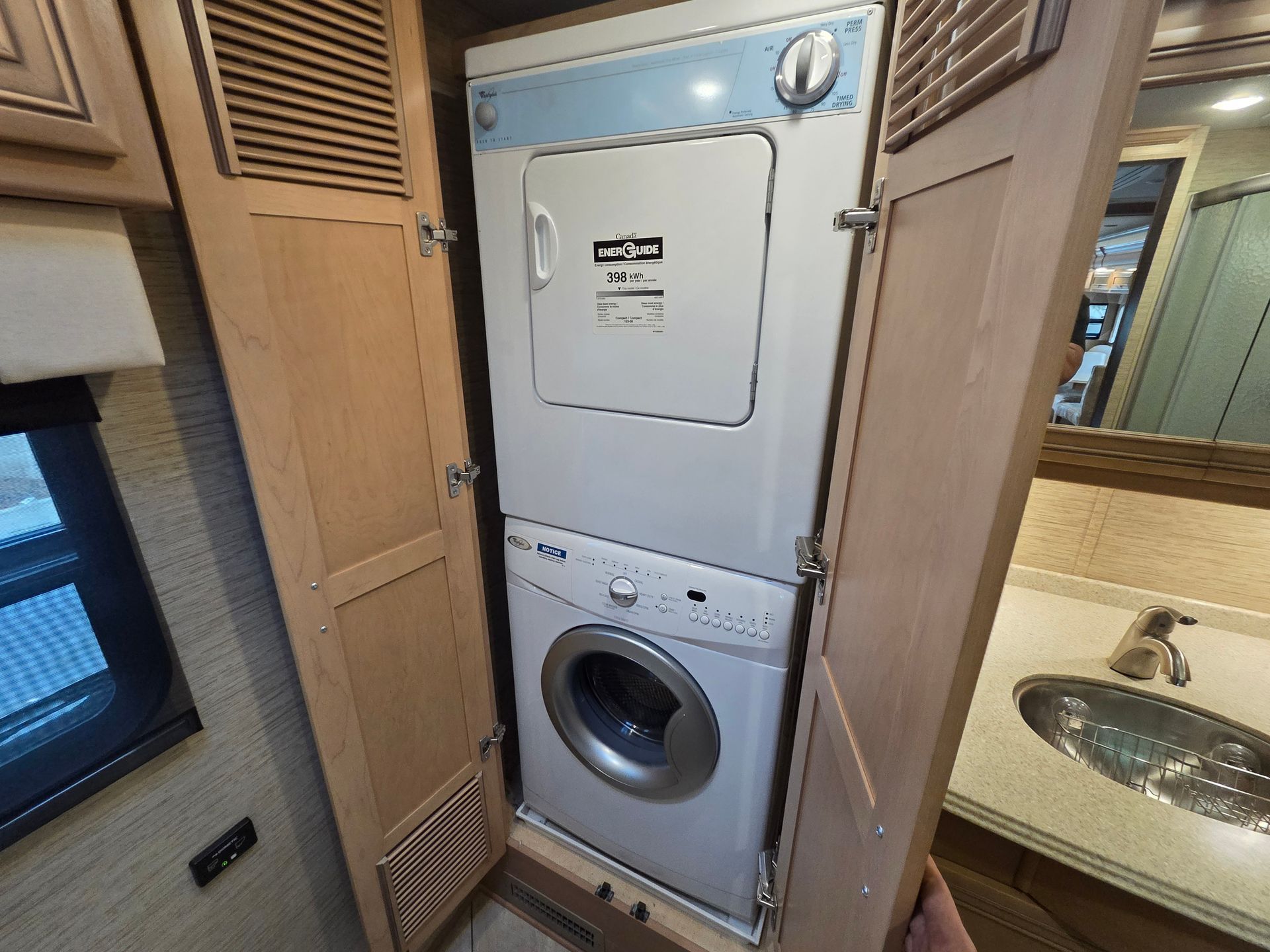 - Appliances: Residential refrigerator, convection microwave, and a stackable washer/dryer are common