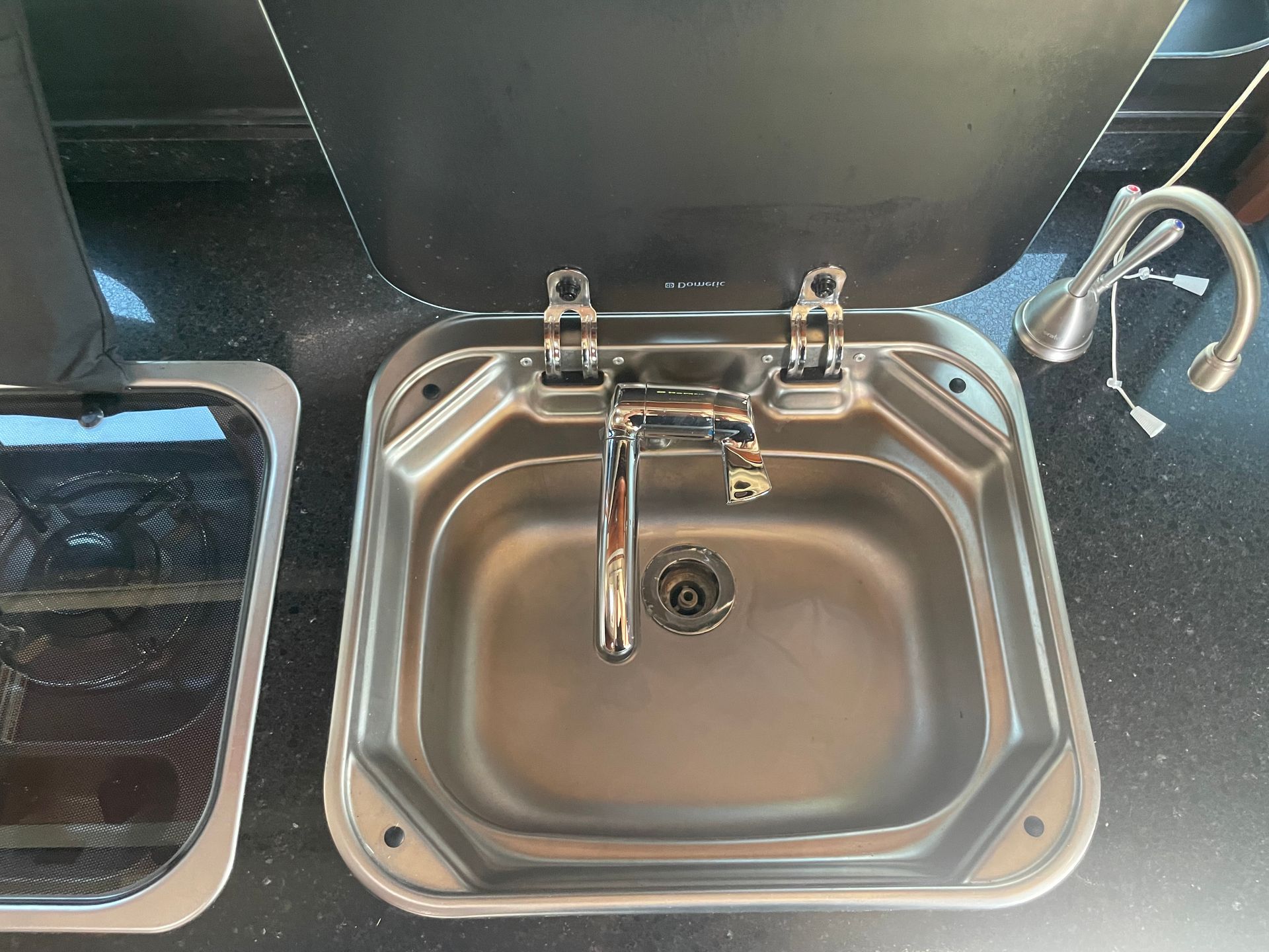 Kitchen: Convection Oven, 2 Door Refrigerator with Locking Doors, Glass Top Stove with 2 Burners, Glass Top Sink