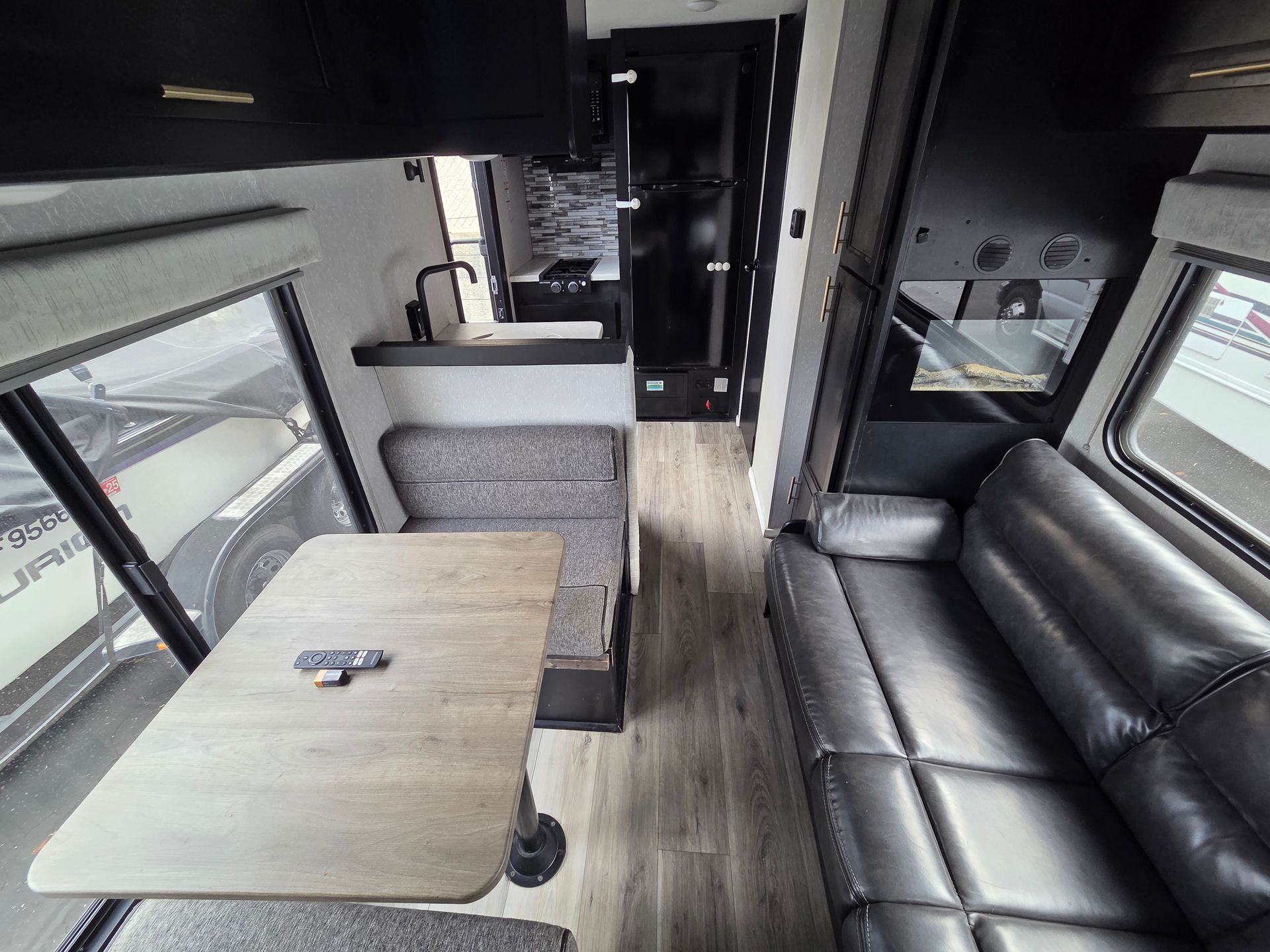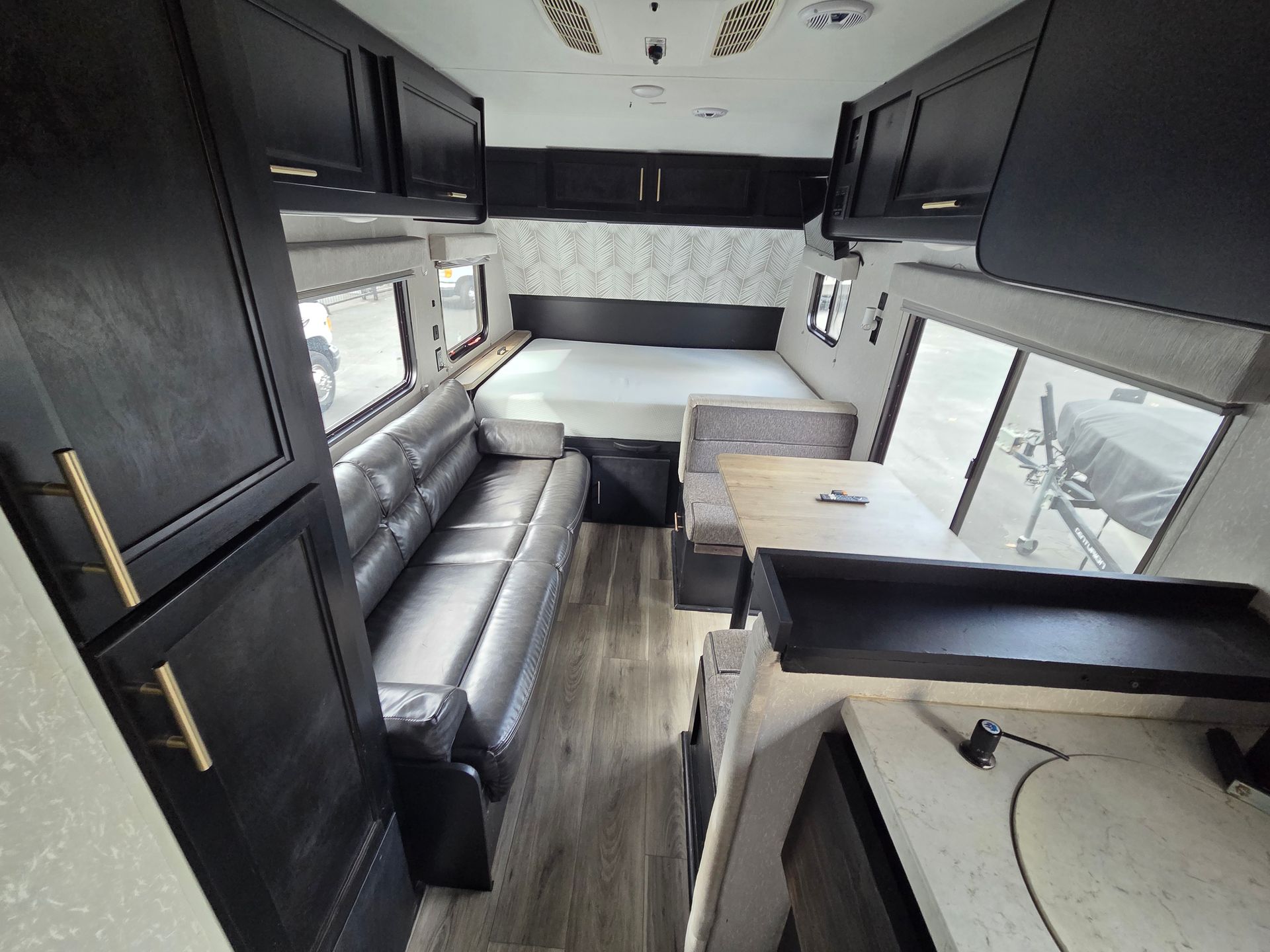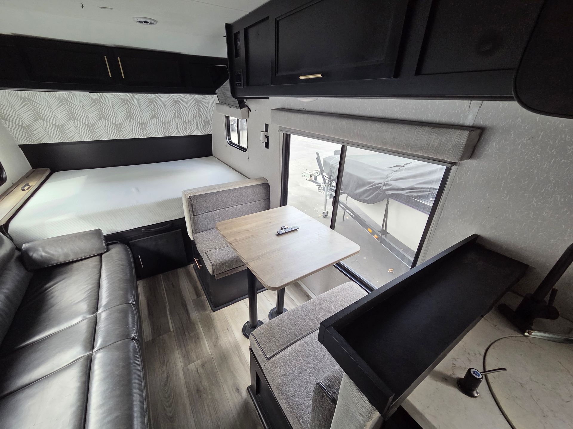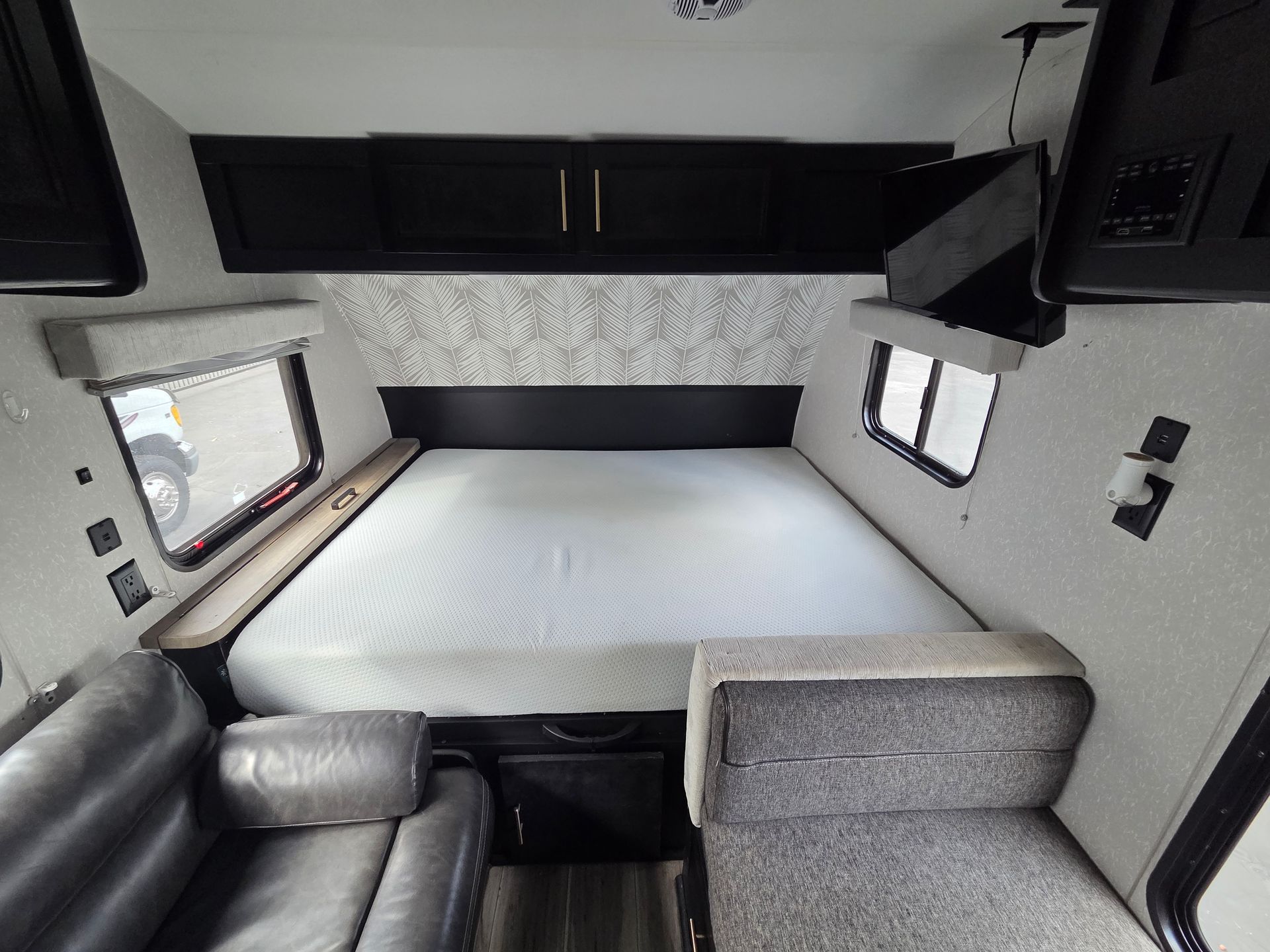 Sleeps up to 5, with a front queen bed, a jack-knife sofa that converts to a bed, and a dinette that converts to a bed.