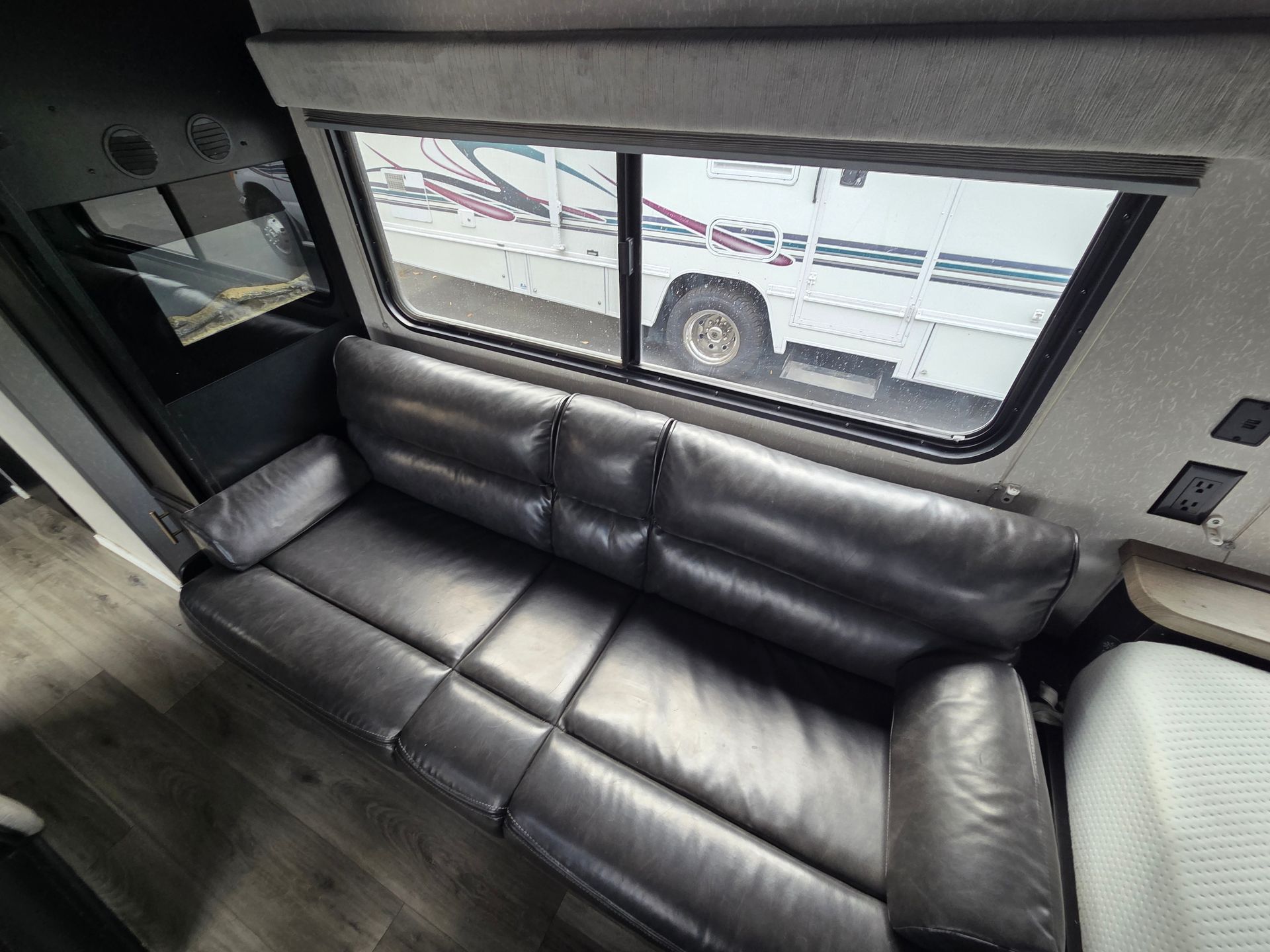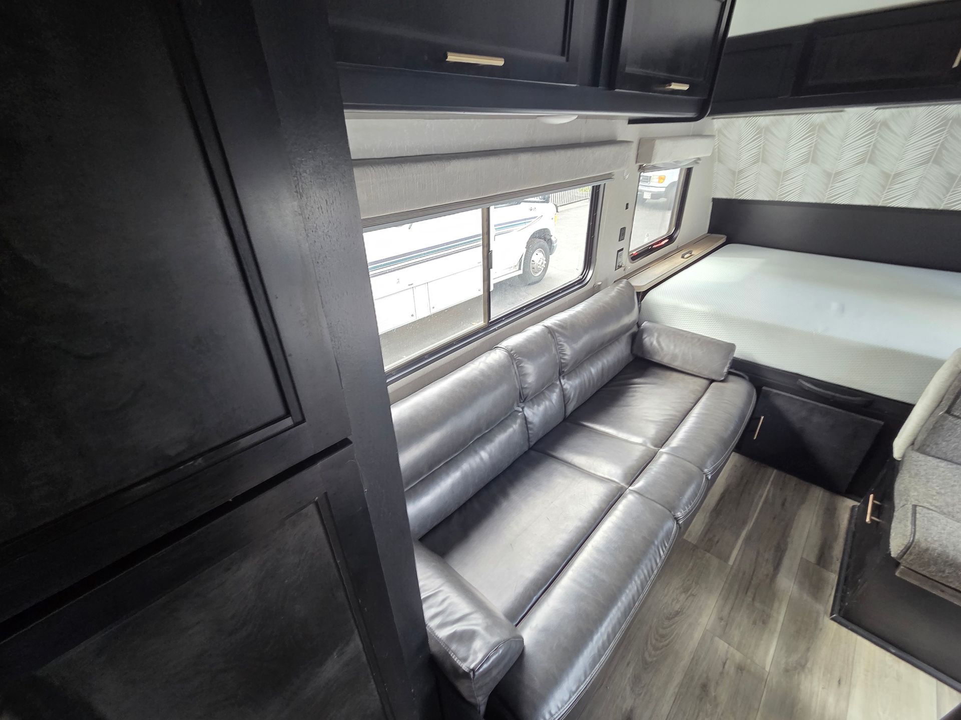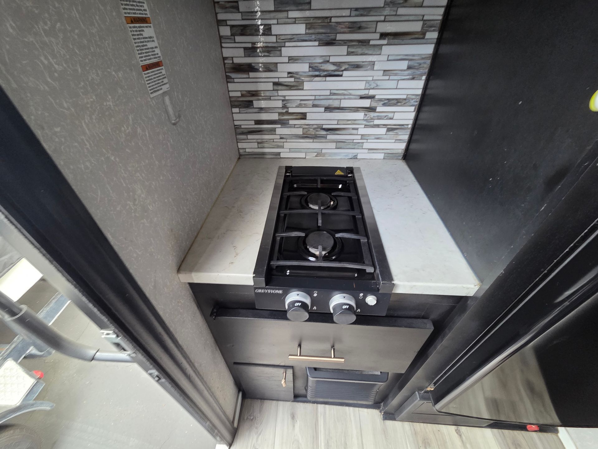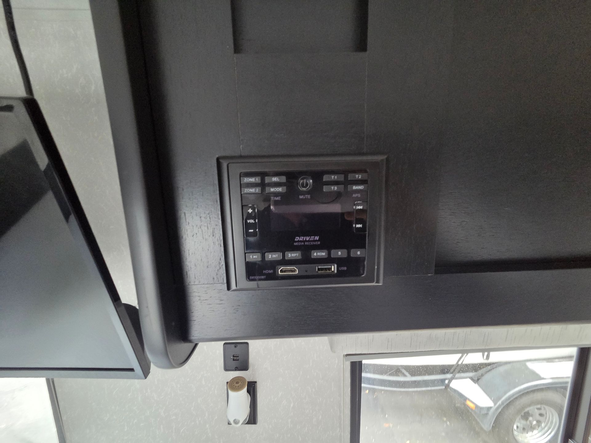 Power awning, exterior storage with a large exterior door, and exterior speakers.