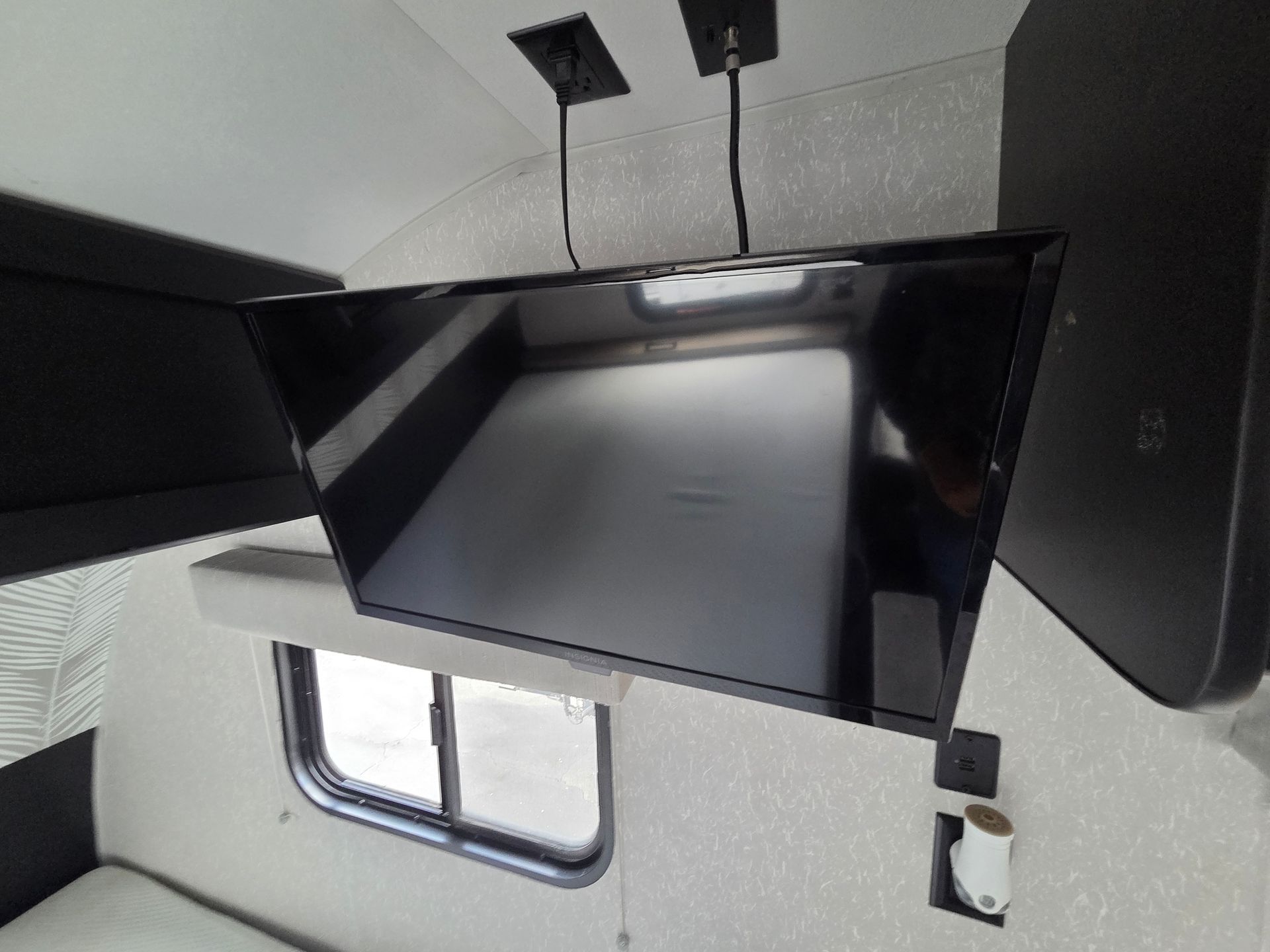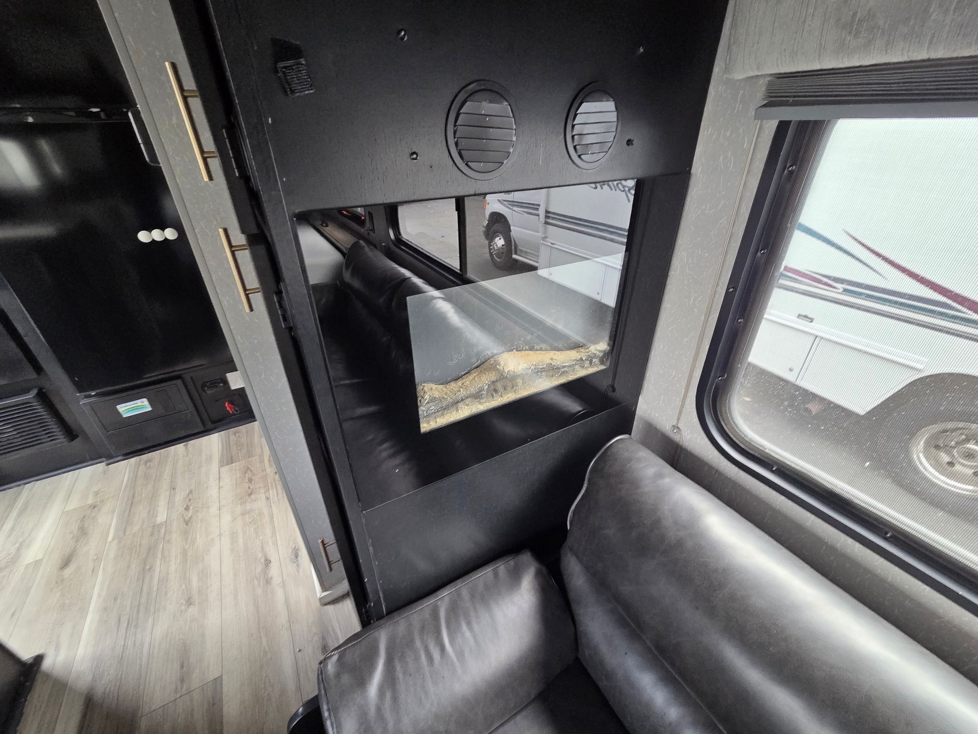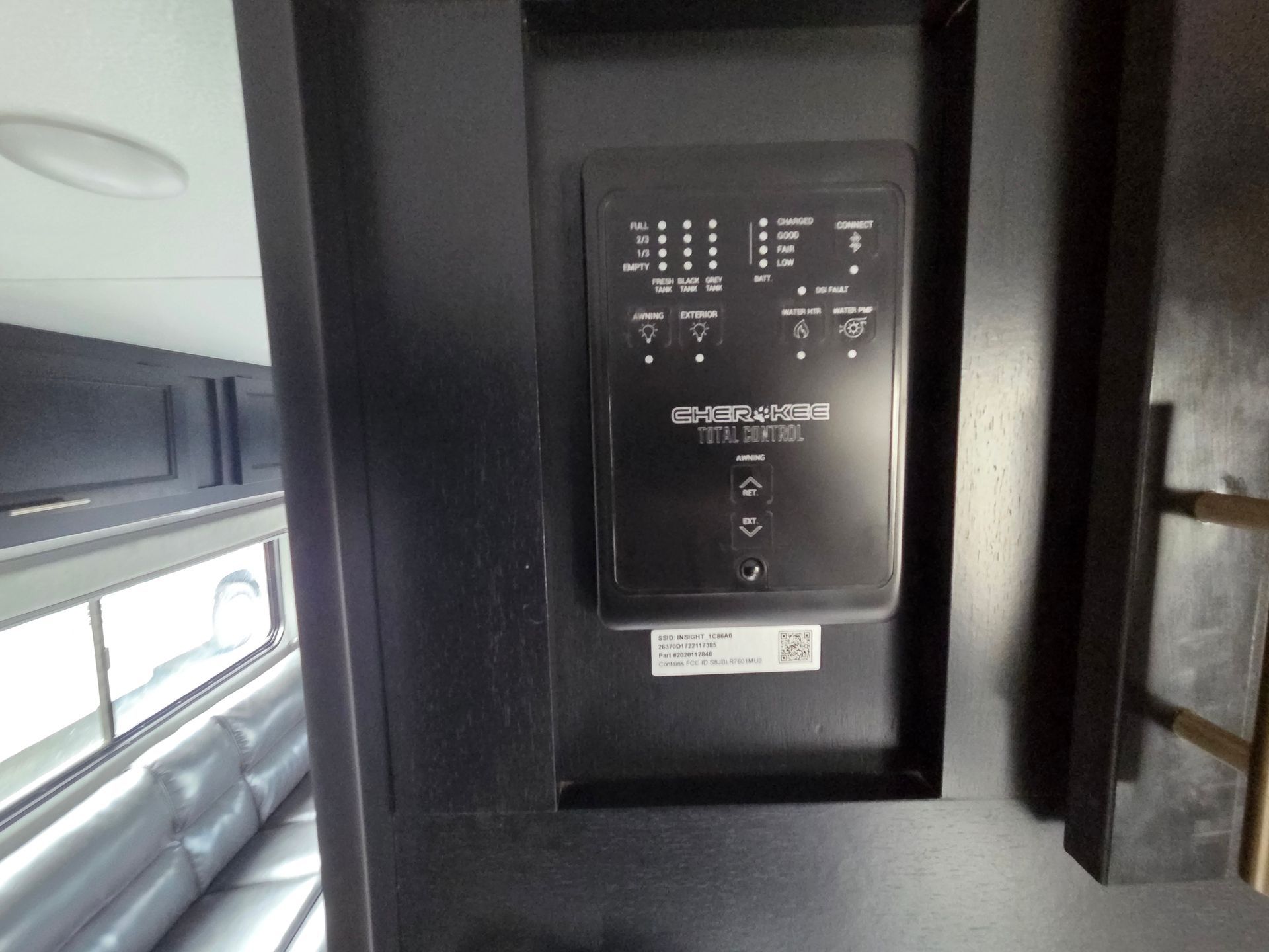 Panoramic window, indoor/outdoor speakers, and an integrated control panel for managing lights, water, and tank levels.