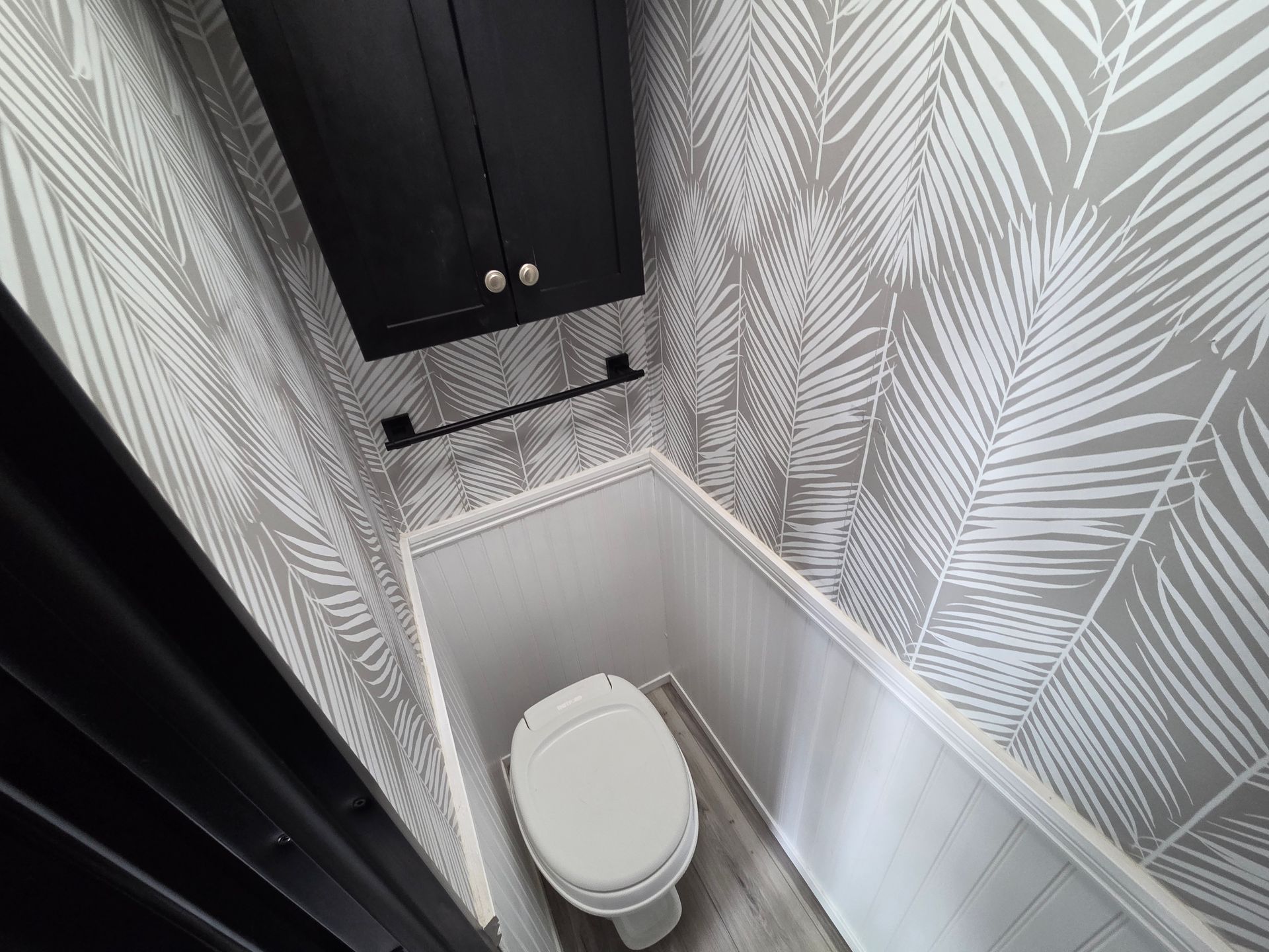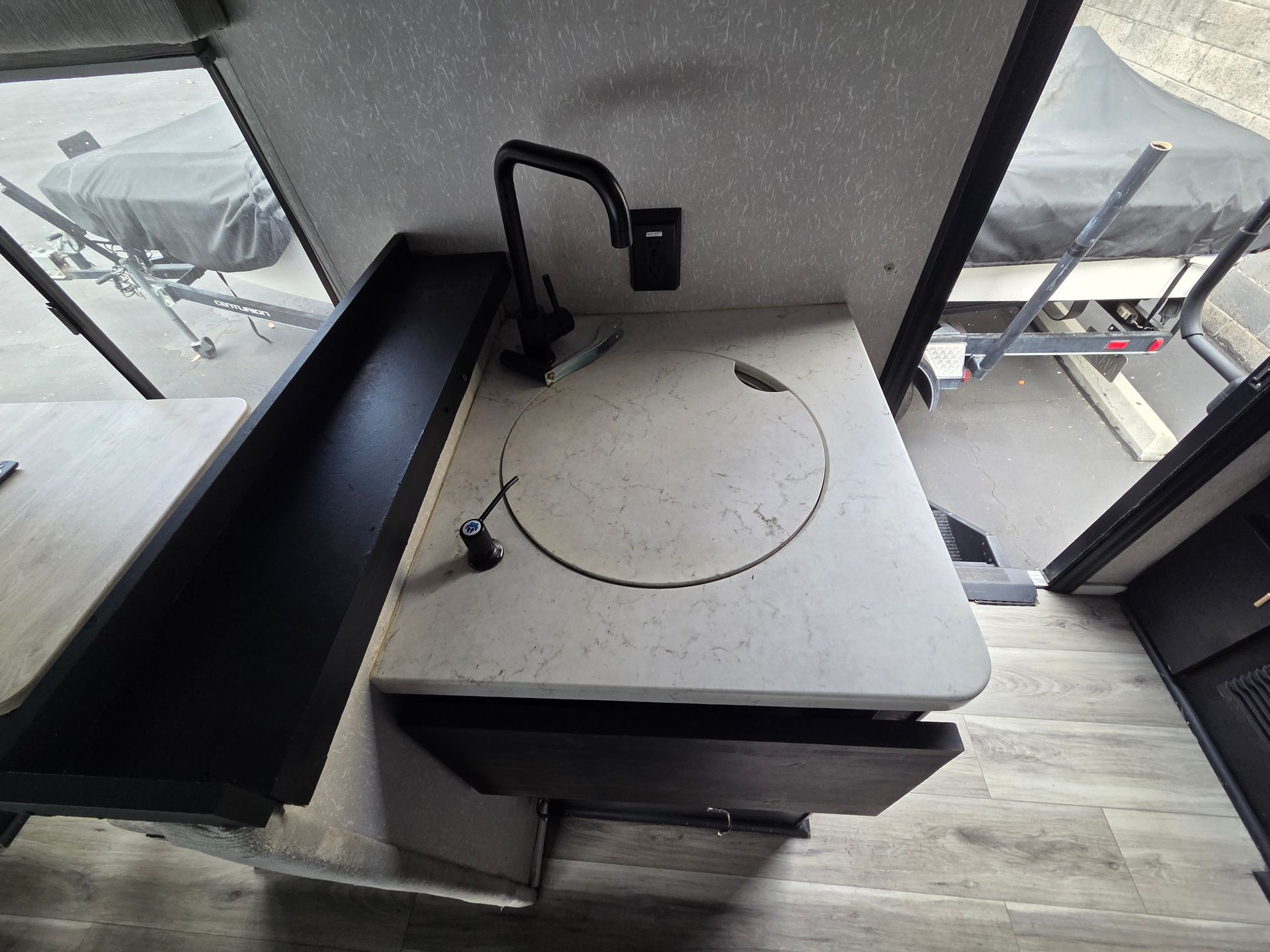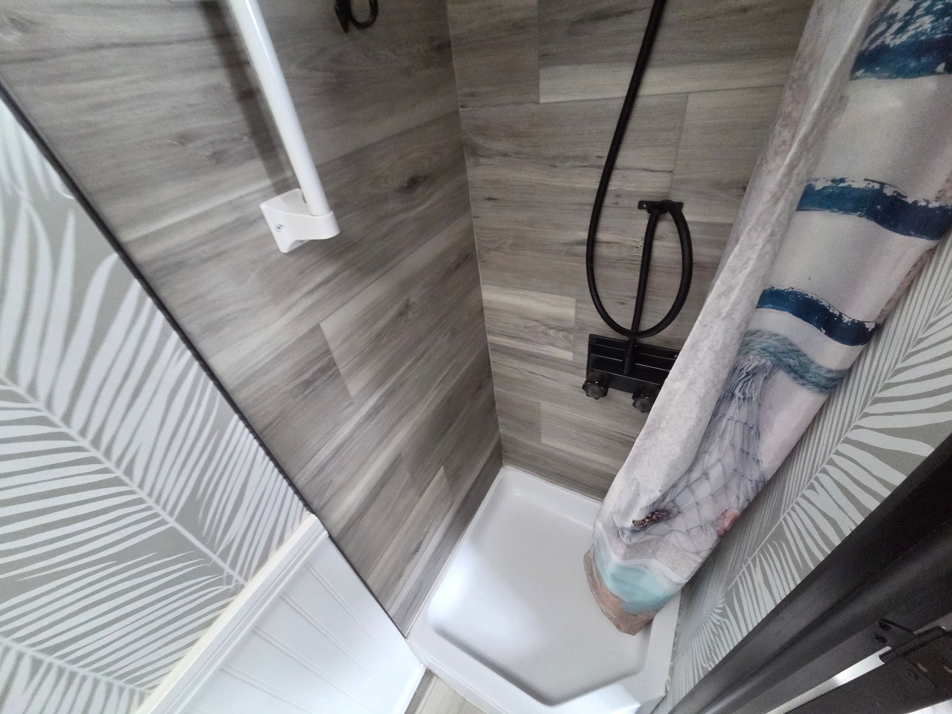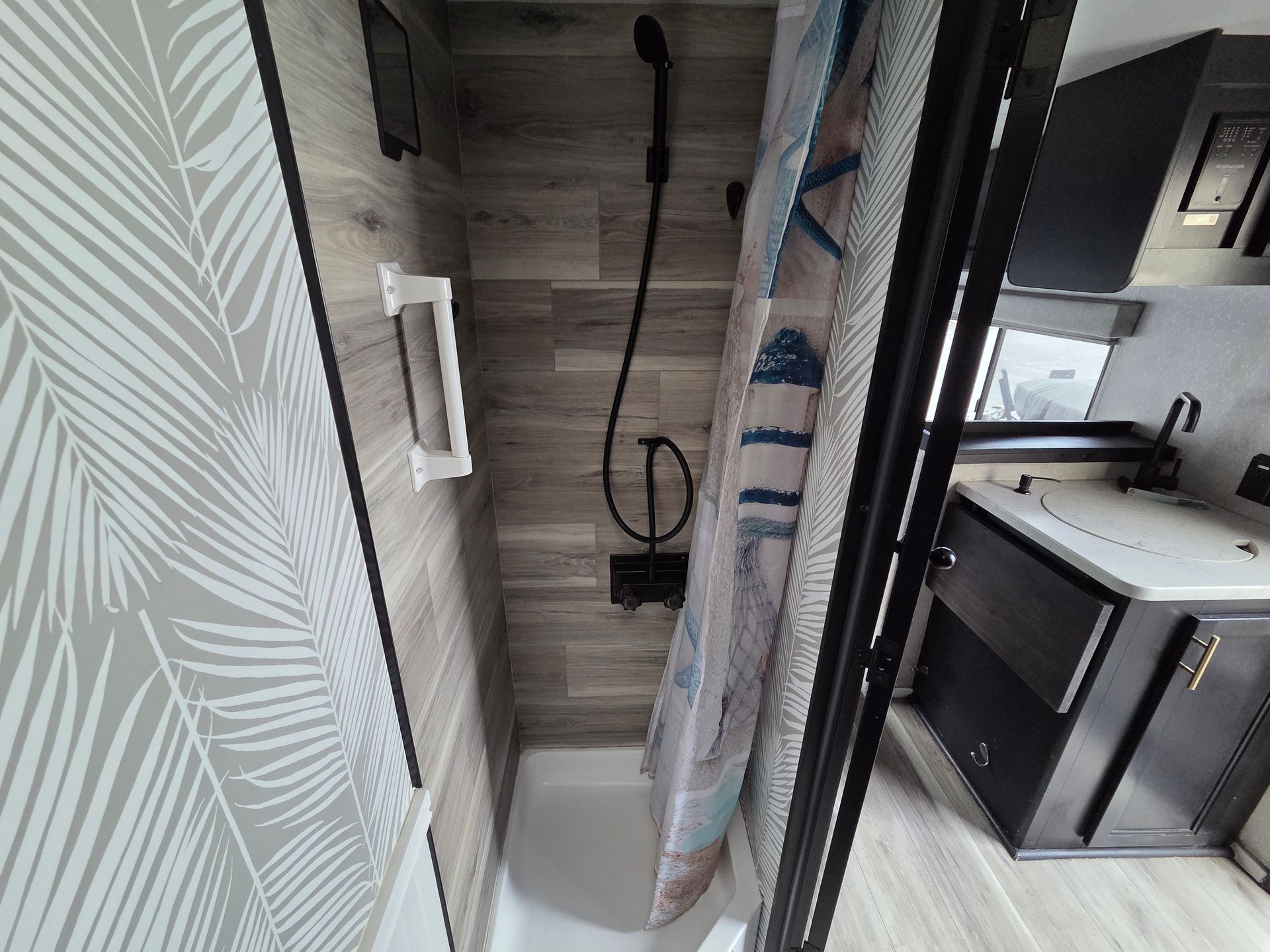 Panoramic window, indoor/outdoor speakers, and an integrated control panel for managing lights, water, and tank levels.