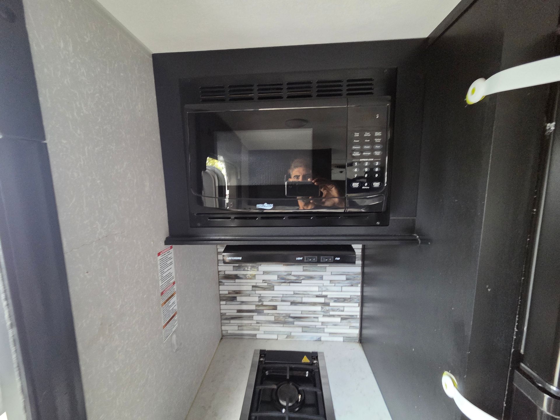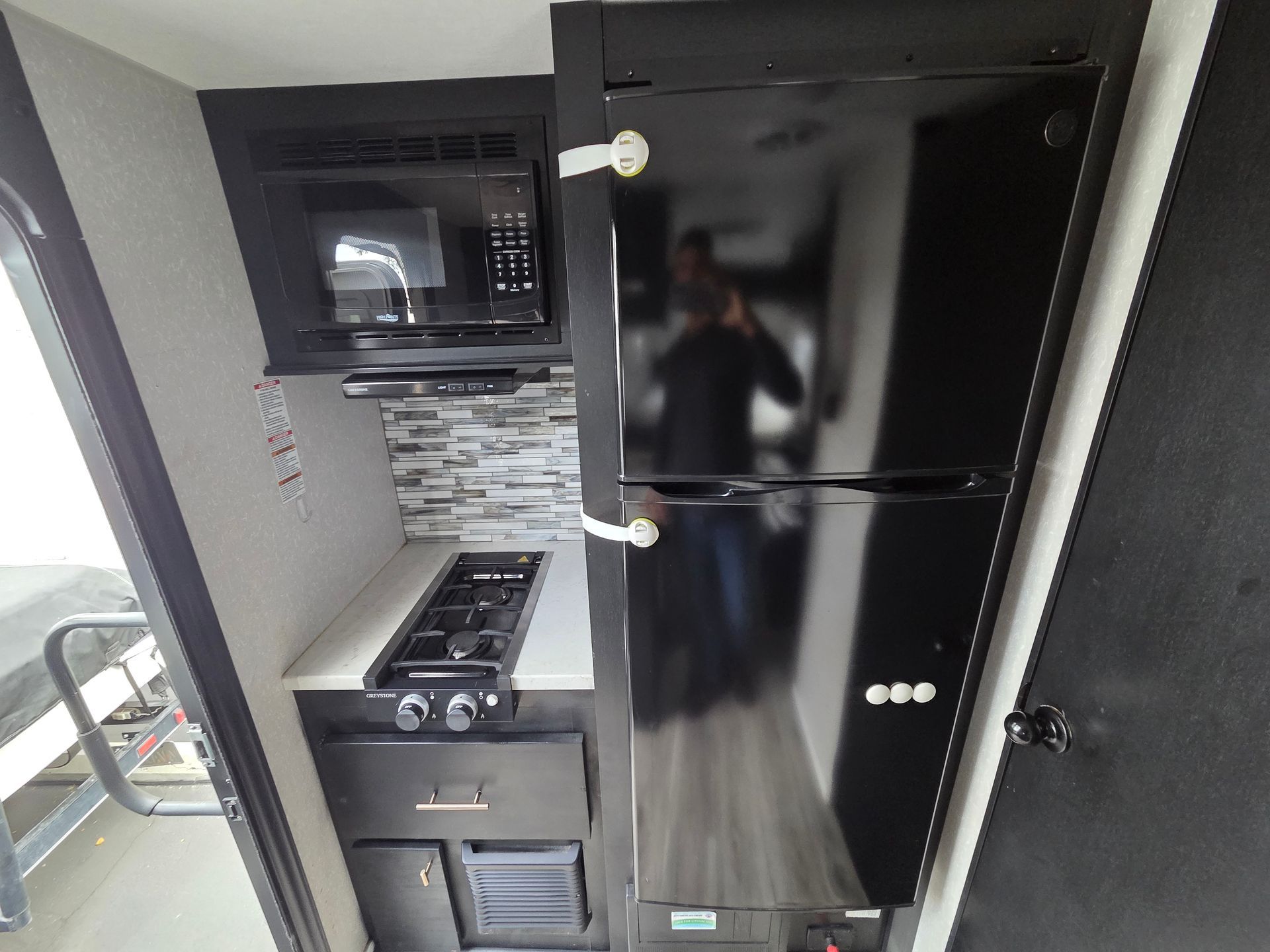 Rear kitchen with a large sink, flush-mount glass cooktop, microwave, and 10.3 or 11 cubic foot refrigerator.