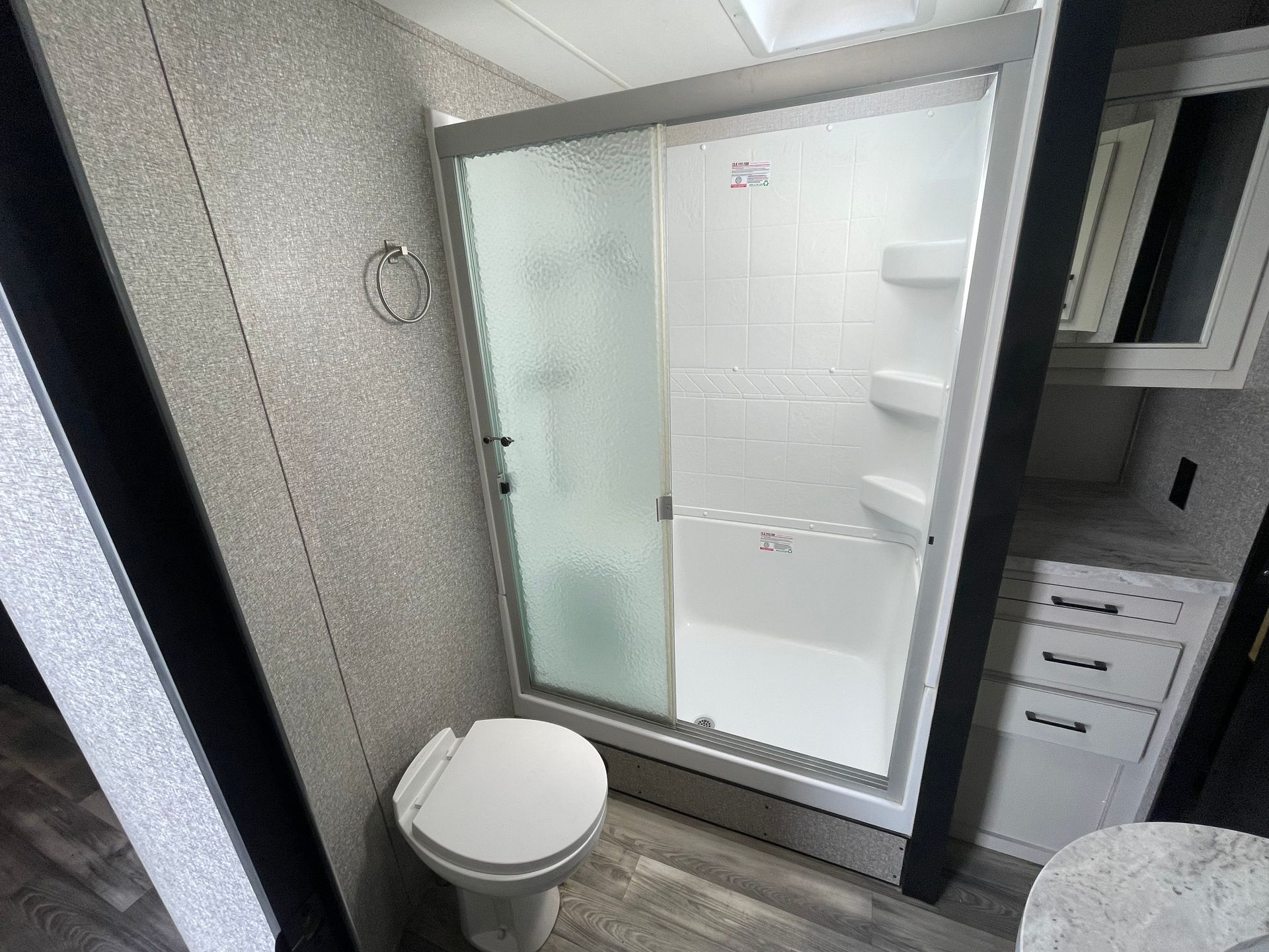 Bathroom: Shower, Toilet, Sink, Dual Entry