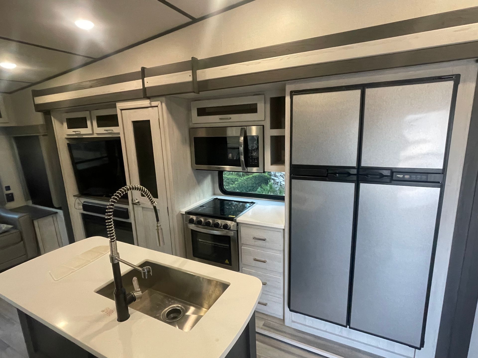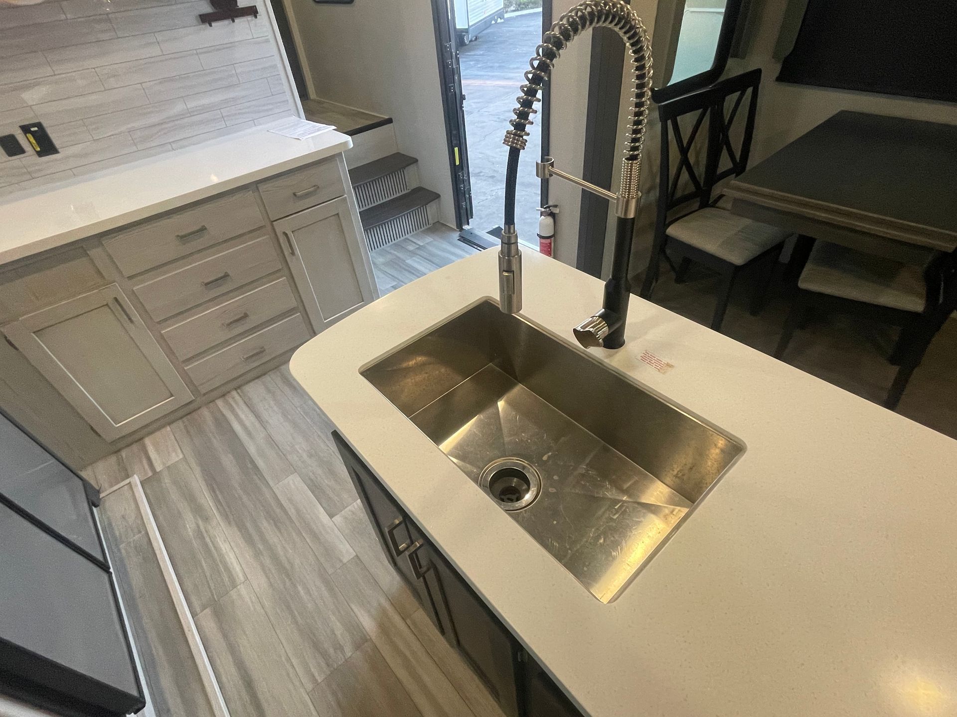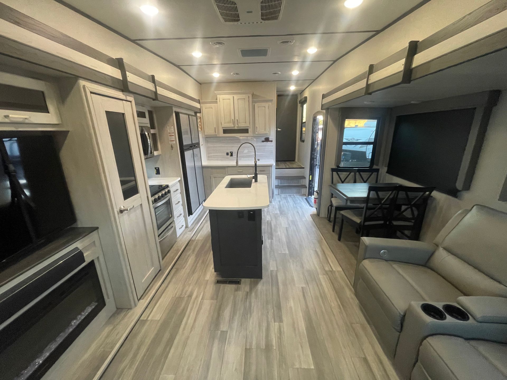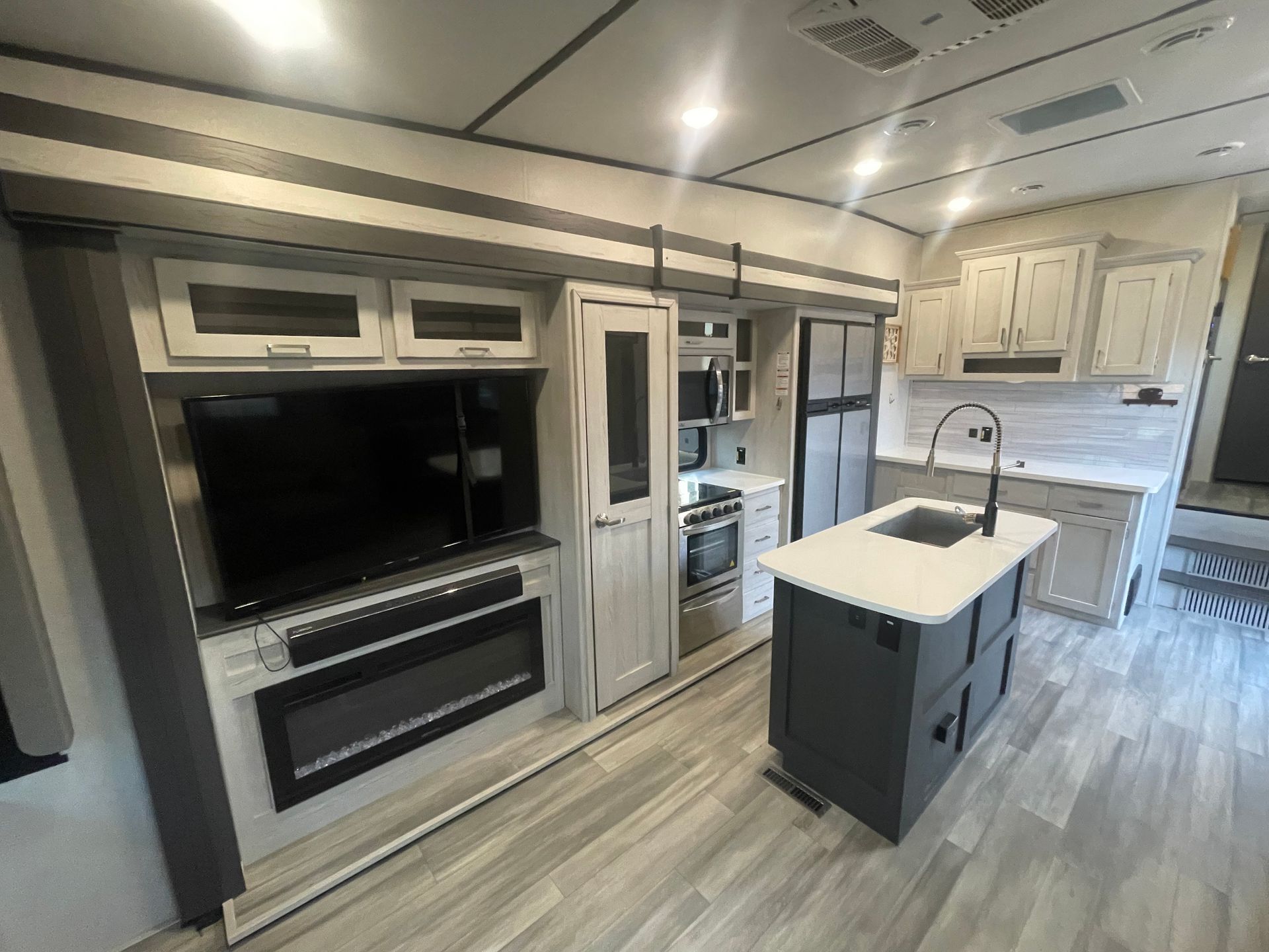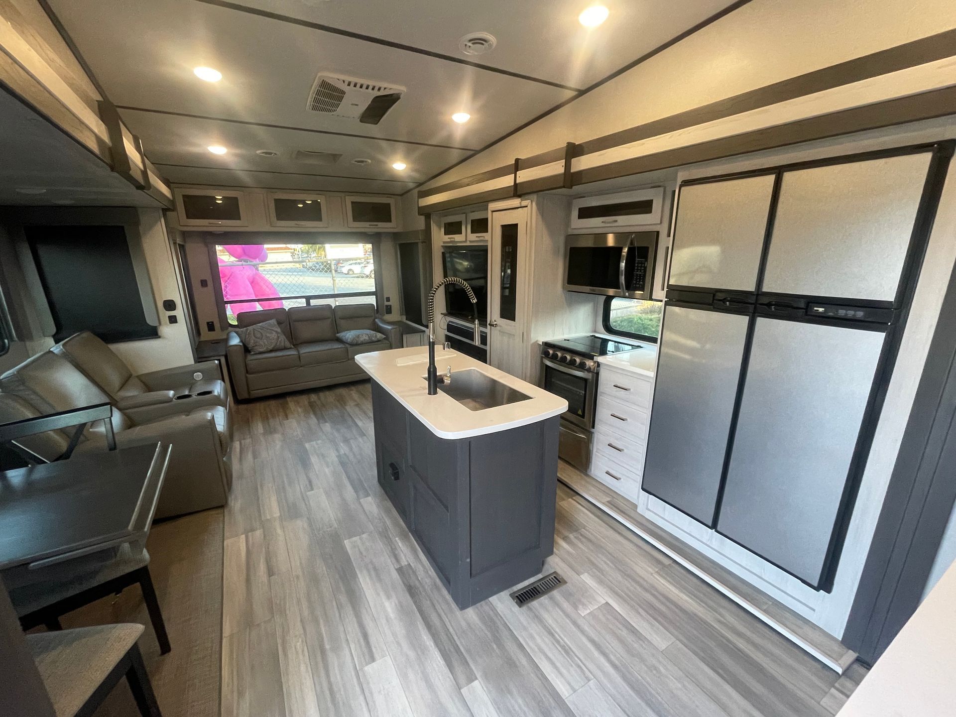 The 2022 Keystone Sprinter 3190RLS is a rear-living fifth-wheel with three slideouts and sleeping capacity for three to four people. Key features include a king-size bed, a kitchen island, and a spacious rear living area with theater seating.