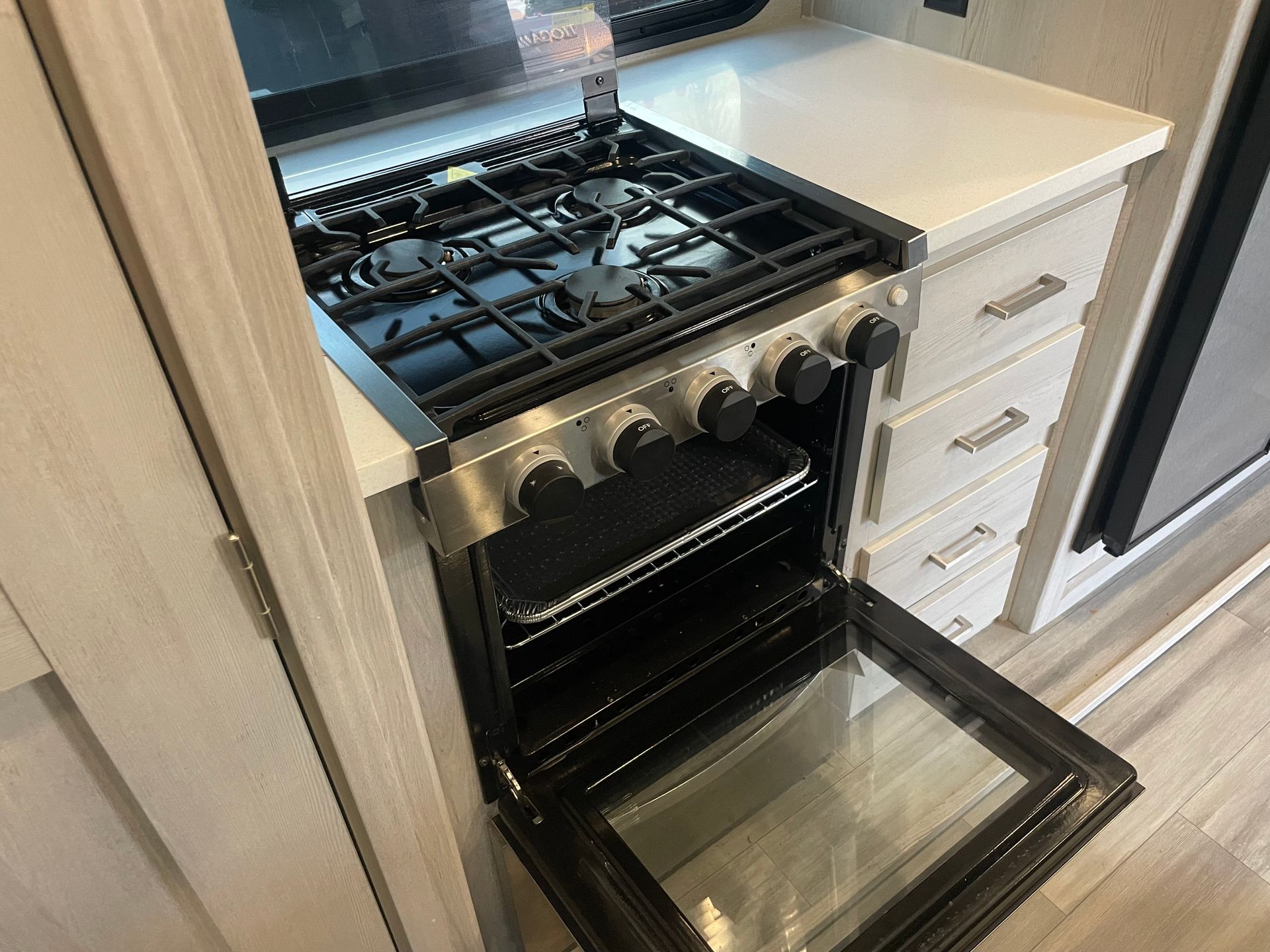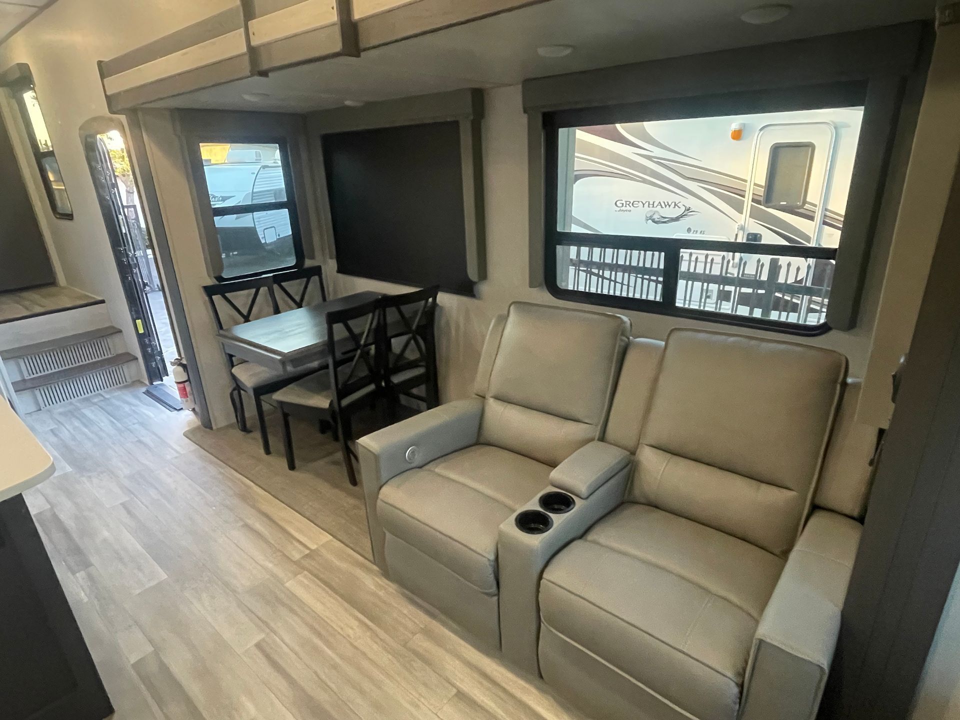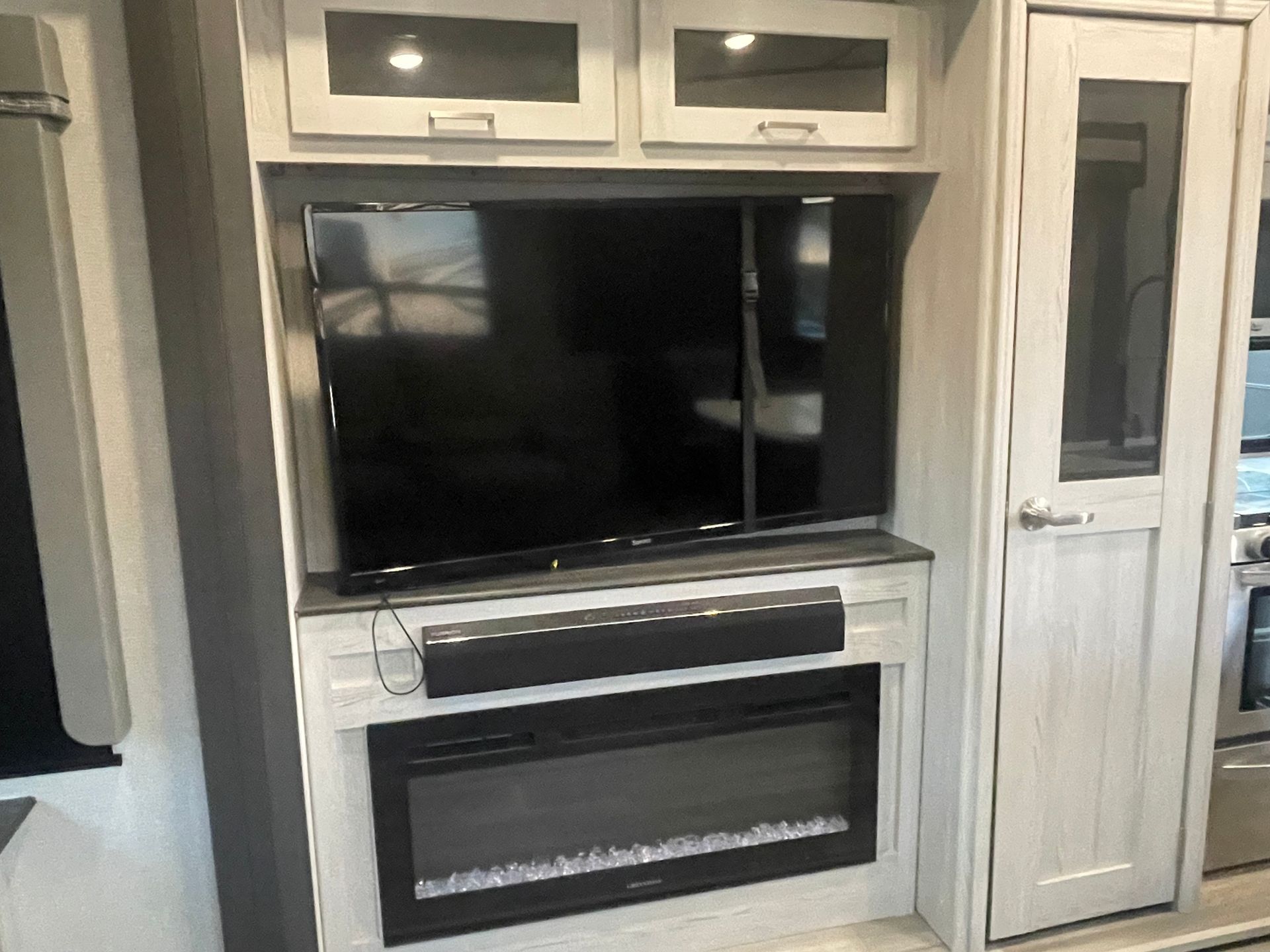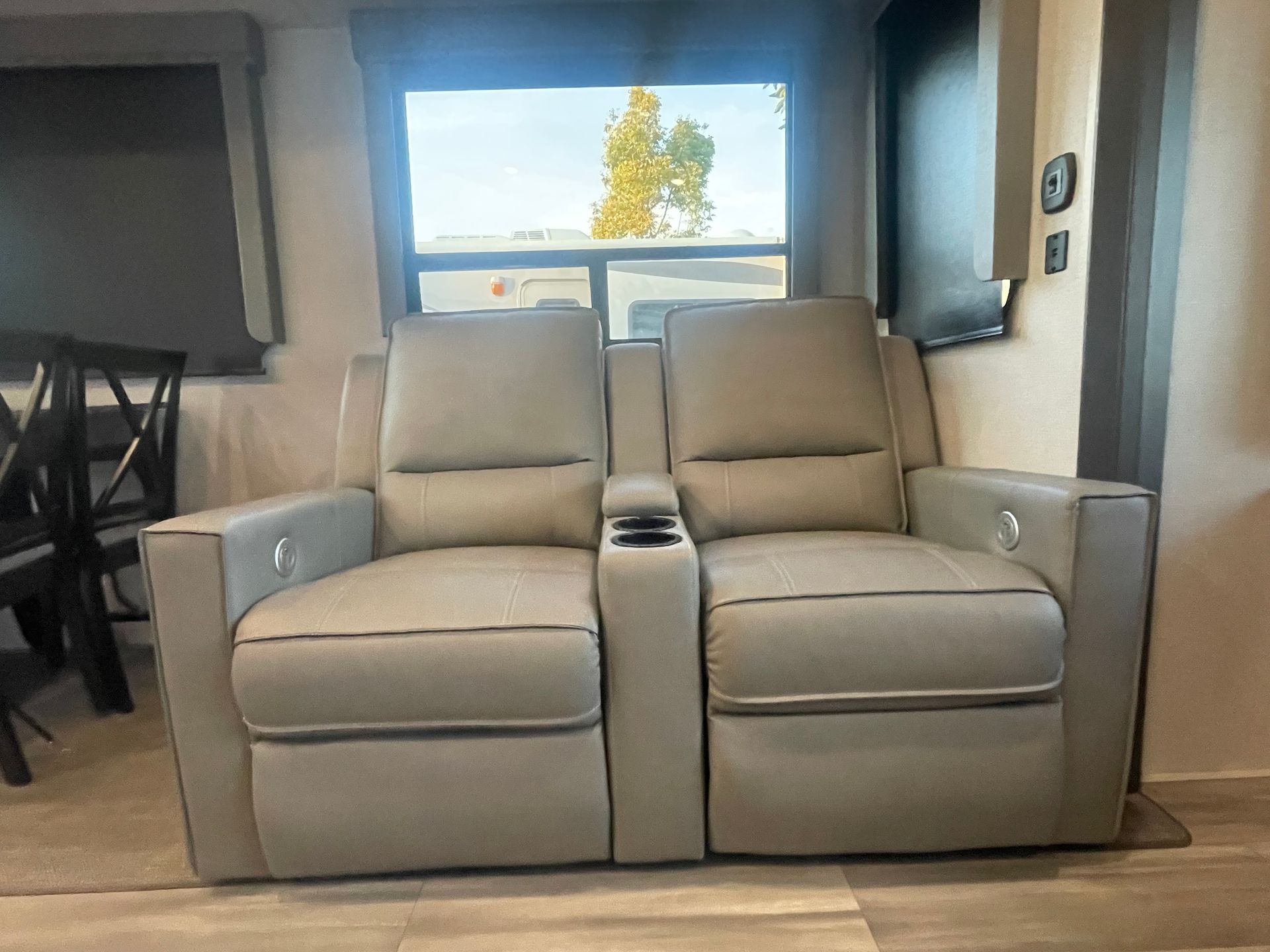 The 2022 Sprinter 3190RLS has three slides, including opposing slides in the living area. The living area features an entertainment center with a 50" HD LED TV and sound bar, a 5,500 BTU electric fireplace, Thomas Payne theater seats, and a tri-fold sofa. The kitchen includes a 12 cu. ft. stainless steel RV refrigerator, a single-basin stainless steel sink, LG solid-surface countertops, and a three-burner gas range. The bedroom offers a king bed with under-bed storage. The bathroom has a fiberglass shower with a skylight and a porcelain toilet.