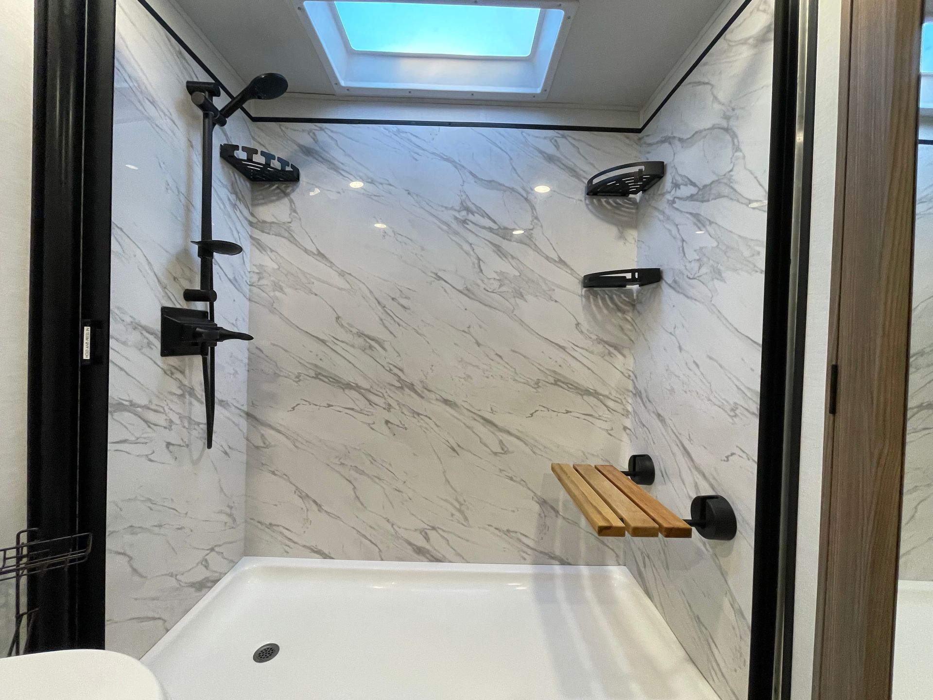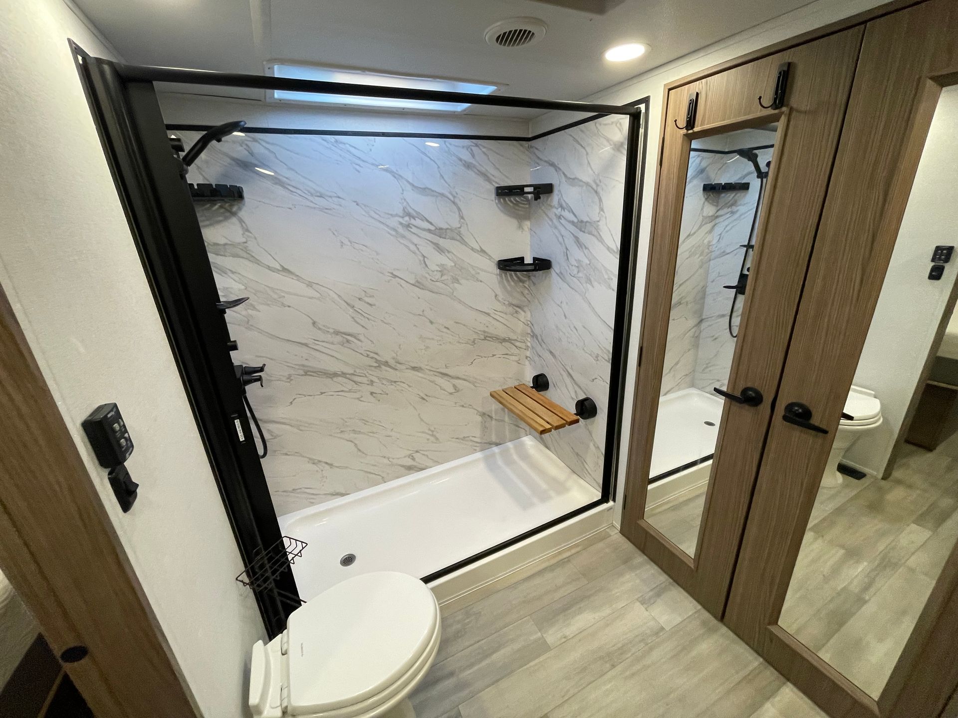 Bathroom: Huge Shower with Wooden Bench, Porcelain Toilet