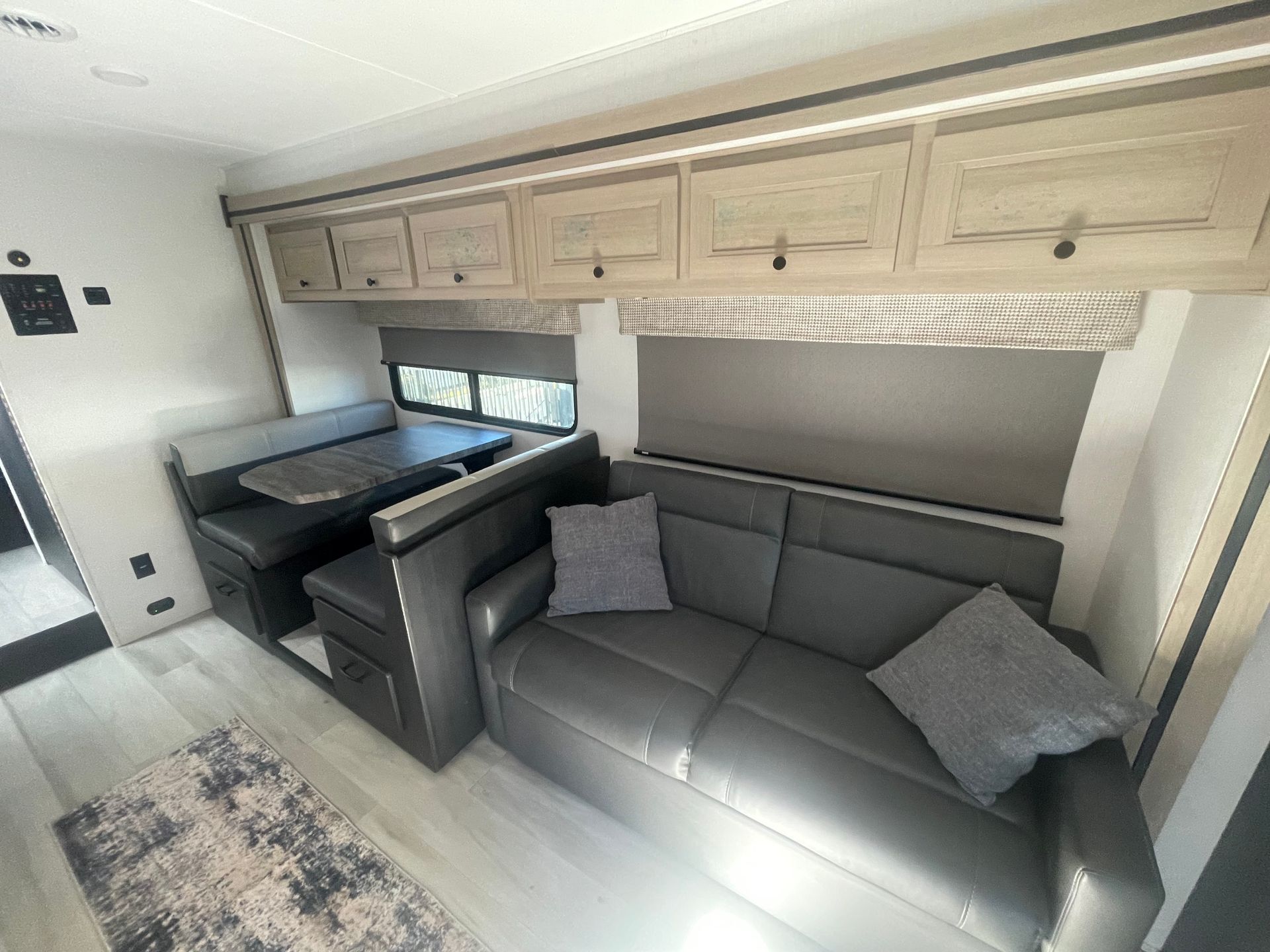 Living Room: Dimming Switch, Couch, Dinette, TV, Plenty of Overhead Storage.